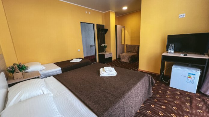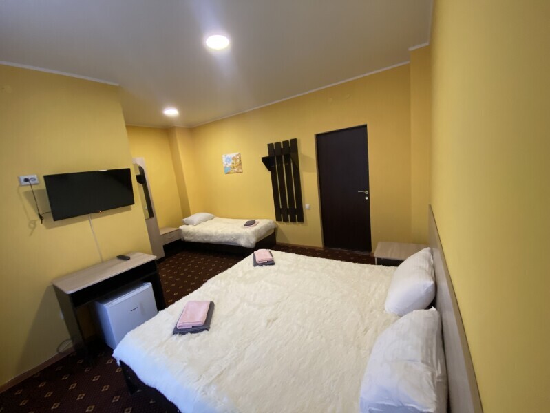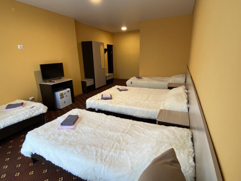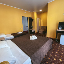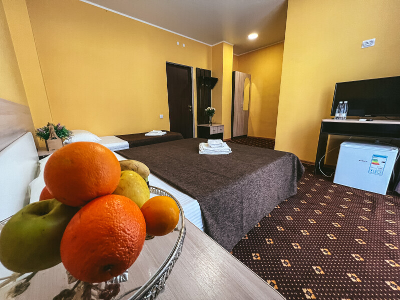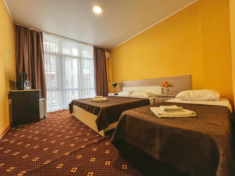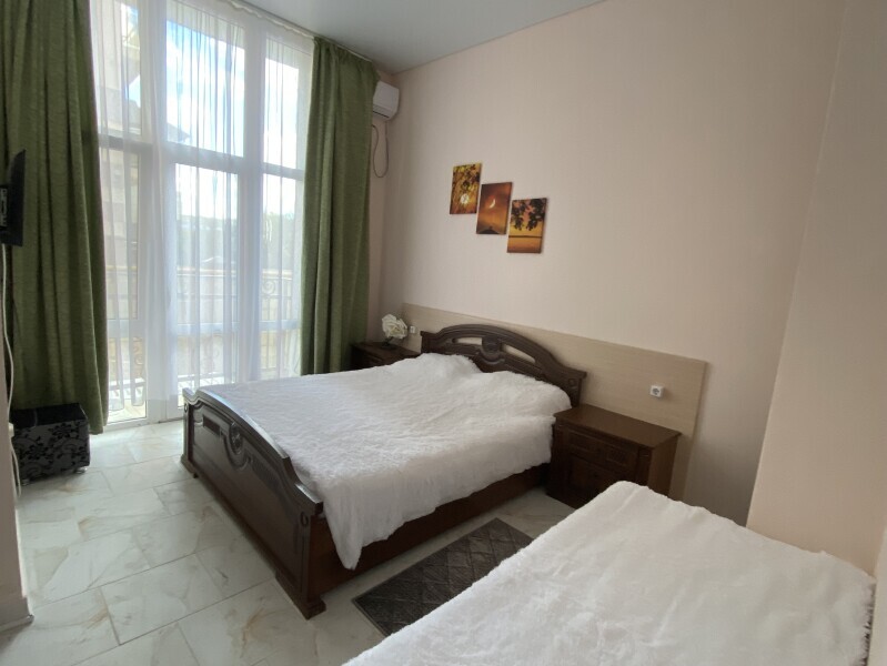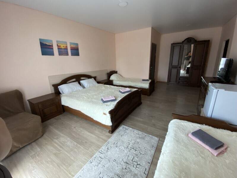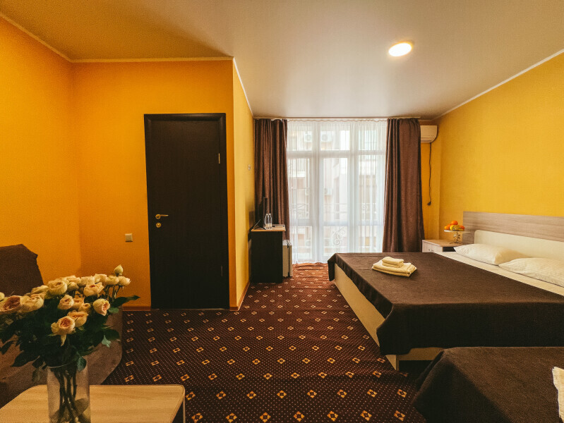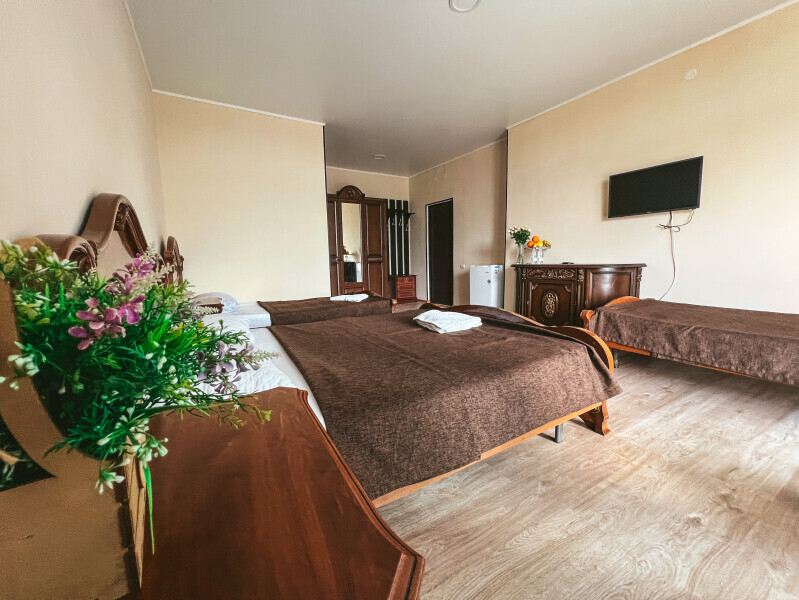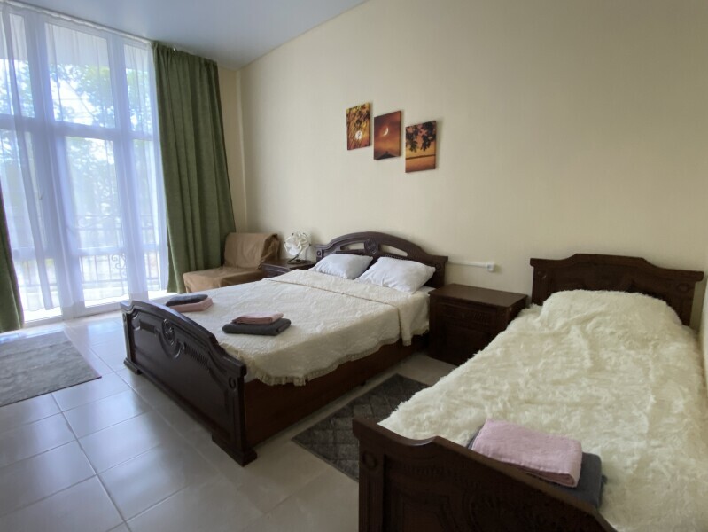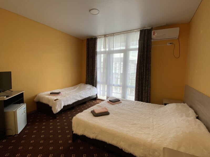 В номере: одна двуспальная и одна односпальная или три односпальные кровати, ортопедические матрацы, прикроватные тумбочки, шкаф для одежды, стол, телевизор, Wi-Fi, кондиционер, мини-холодильник, чайник, фен, набор полотенец, постельное белье, собственный с/у с душем, туалетно-косметические принадлежности, шторы блэкаут, балкон.