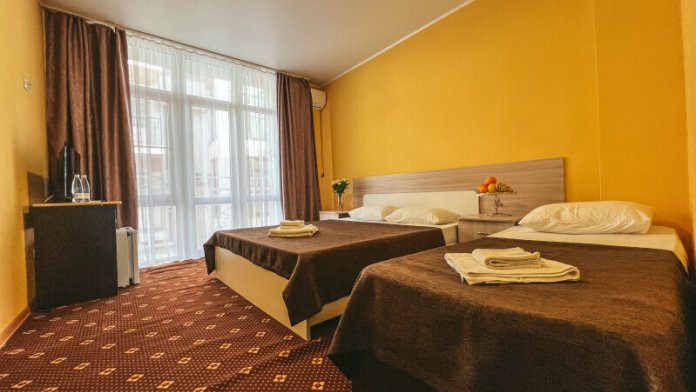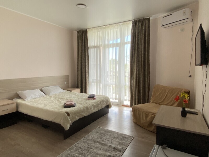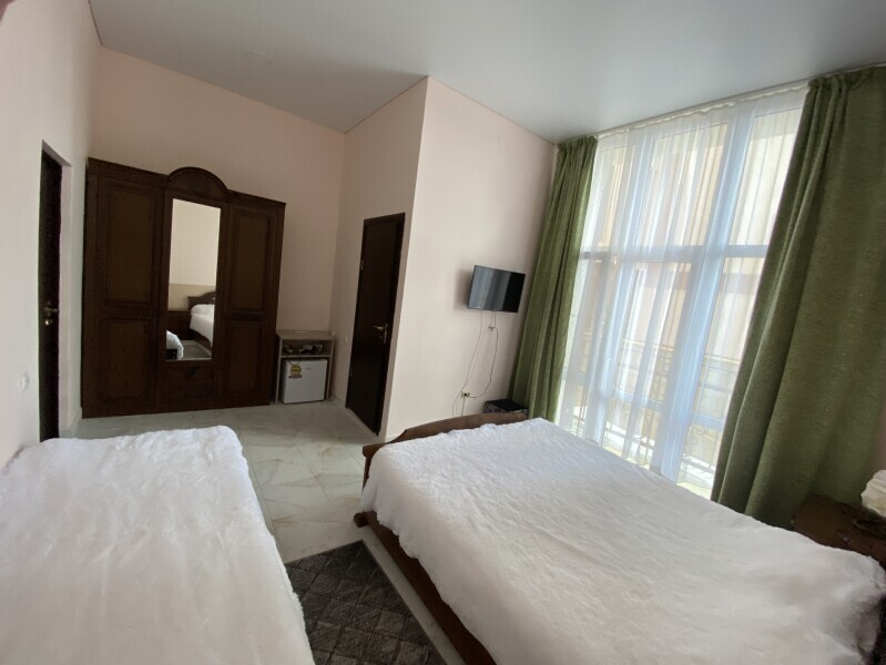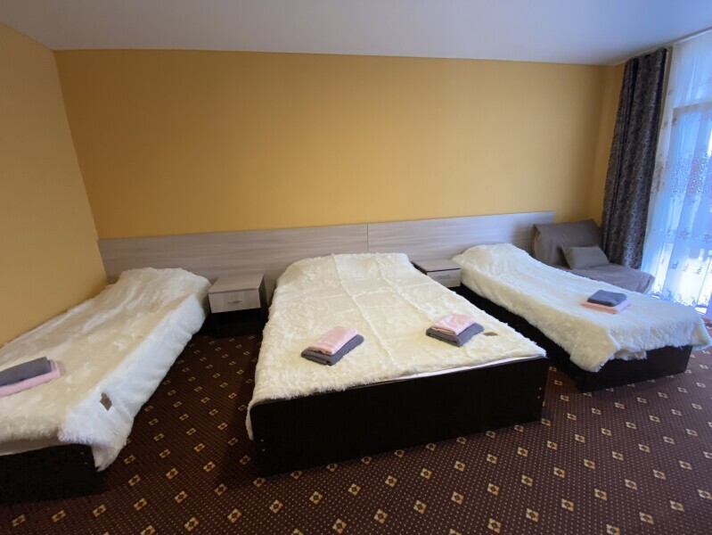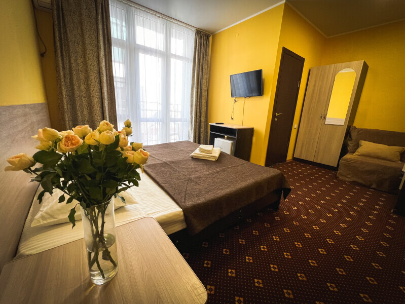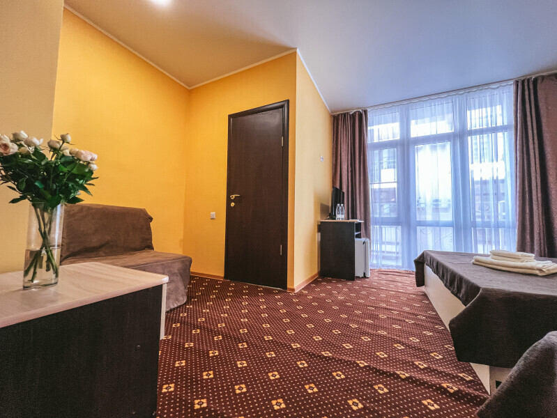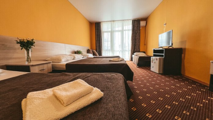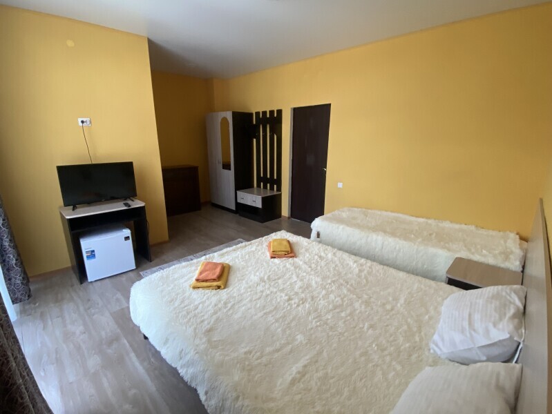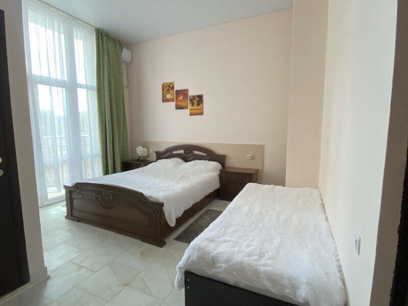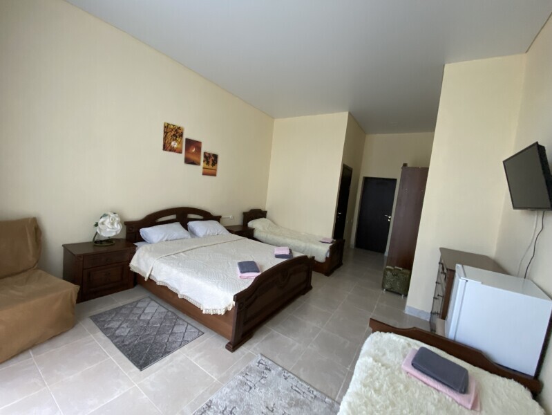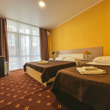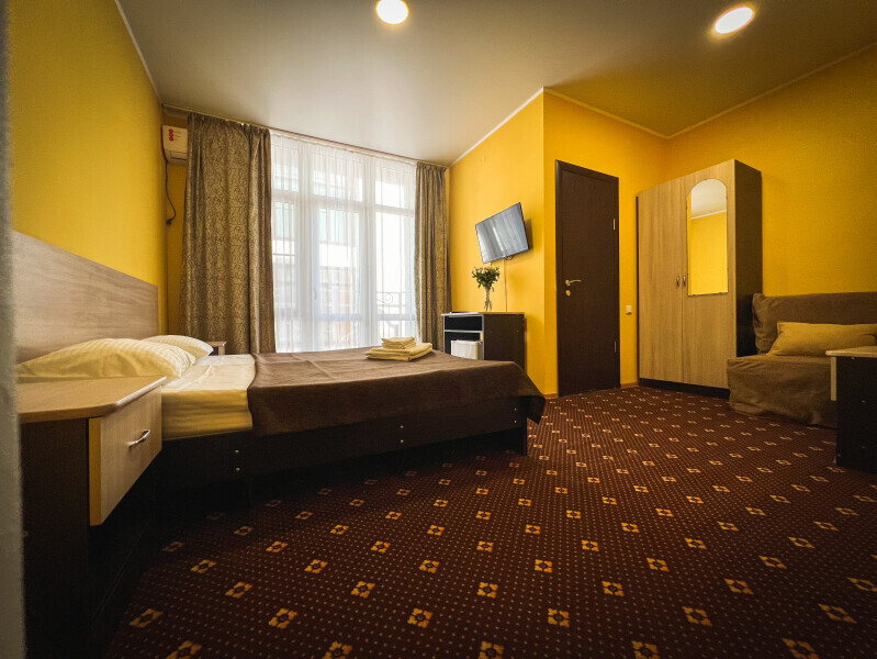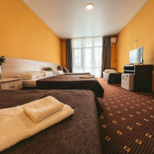 В номере: одна двуспальная и одна односпальная или три односпальные кровати, ортопедические матрацы, прикроватные тумбочки, шкаф для одежды, стол, телевизор, Wi-Fi, кондиционер, мини-холодильник, чайник, фен, набор полотенец, постельное белье, собственный с/у с душем, туалетно-косметические принадлежности, шторы блэкаут, балкон.