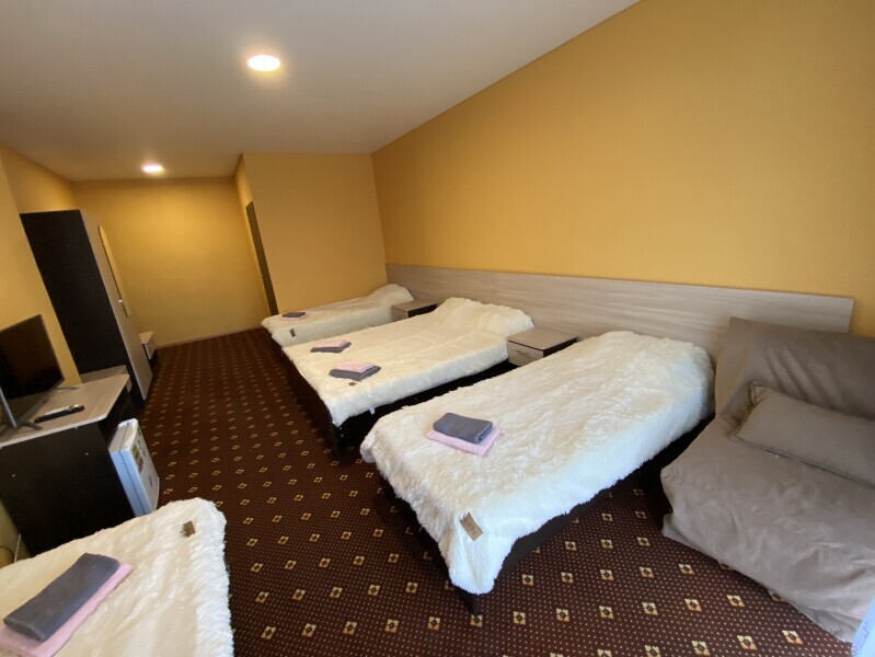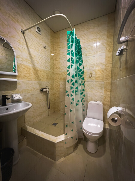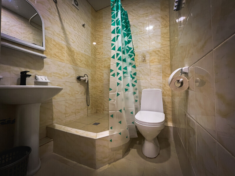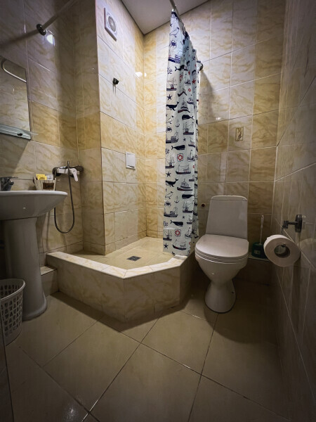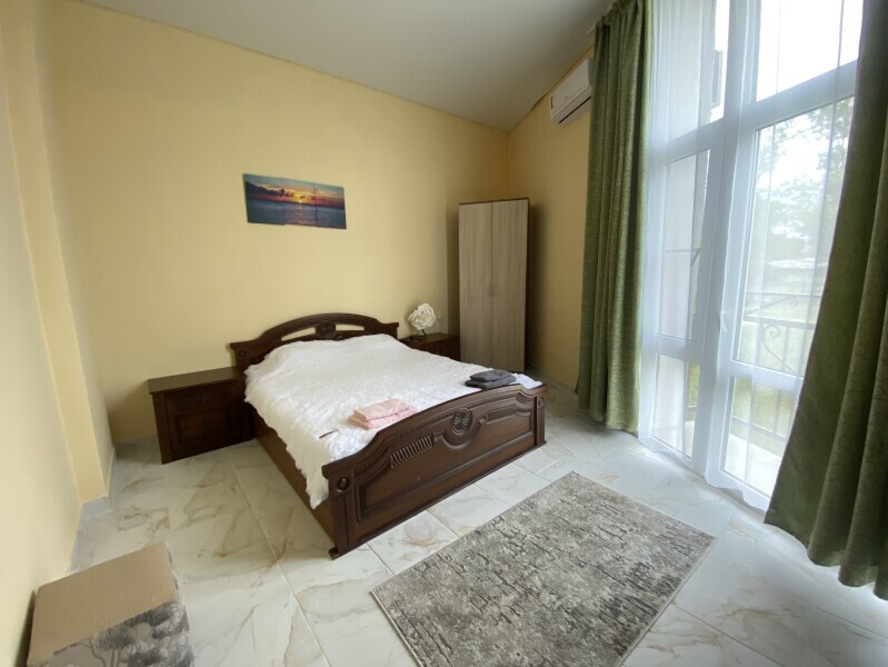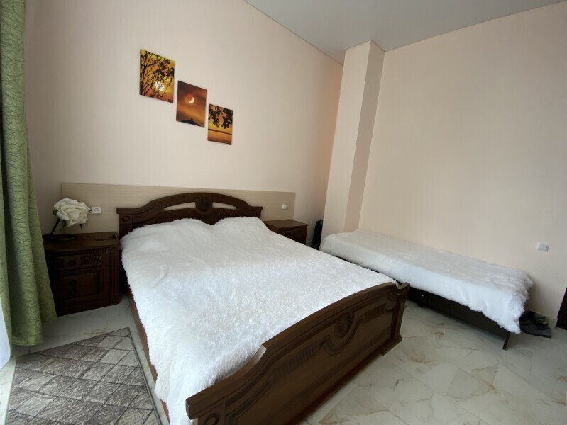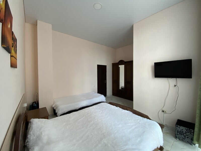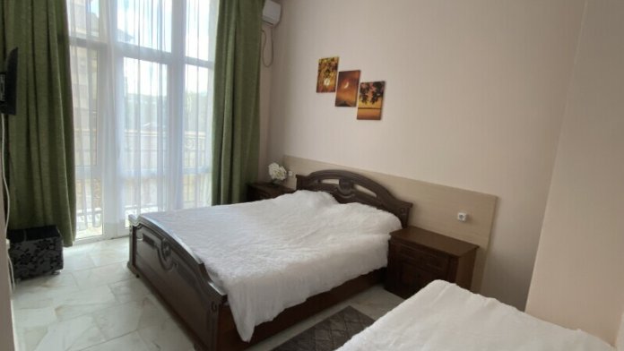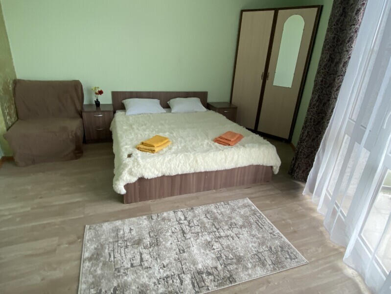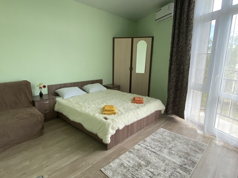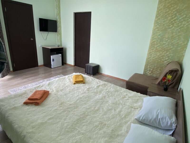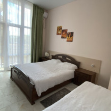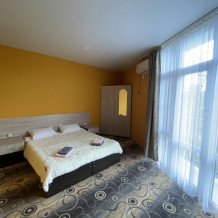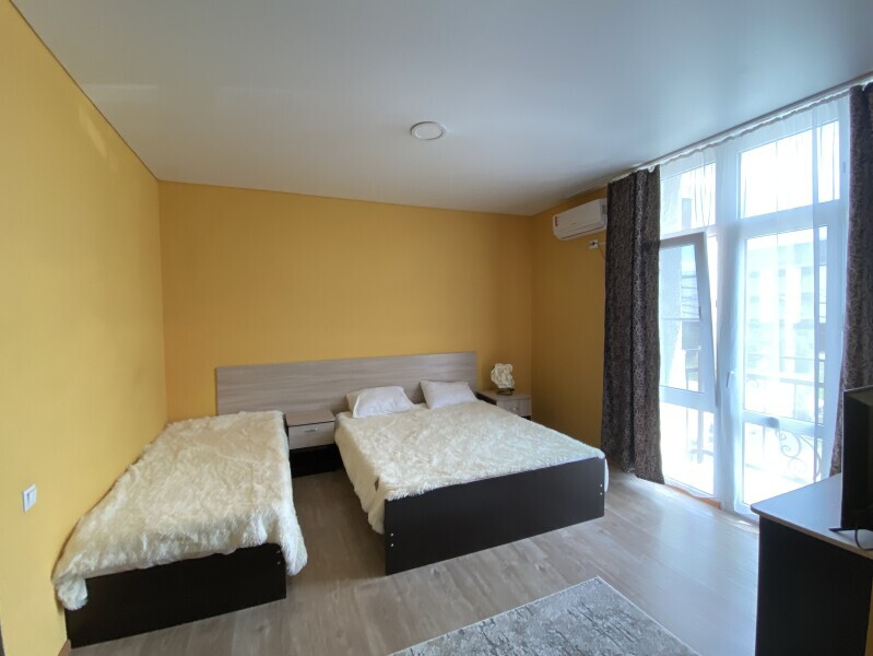 В номере: одна двуспальная и одна односпальная или три односпальные кровати, ортопедические матрацы, прикроватные тумбочки, шкаф для одежды, стол, телевизор, Wi-Fi, кондиционер, мини-холодильник, чайник, фен, набор полотенец, постельное белье, собственный с/у с душем, туалетно-косметические принадлежности, шторы блэкаут, балкон.