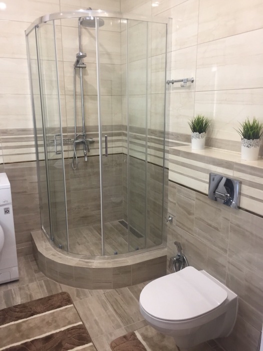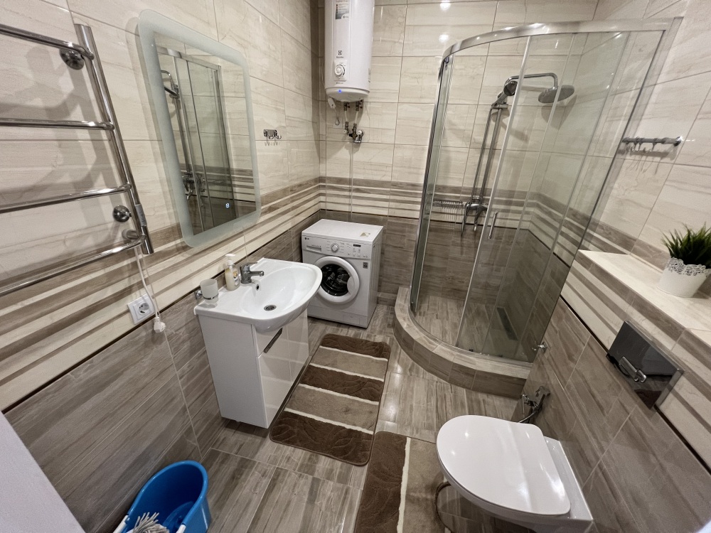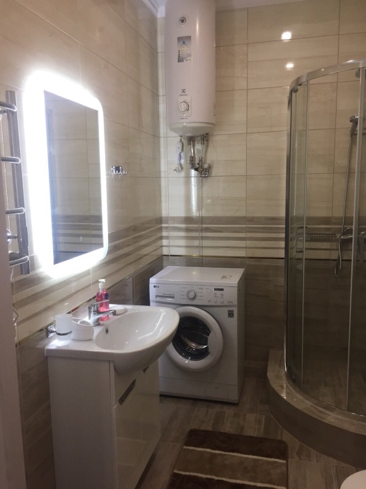 Сан.узел : душевая кабина, раковина, унитаз, гигиенический душ, бойлер, стиральная машинка, фен. Вода холодная/ горячая постоянно.