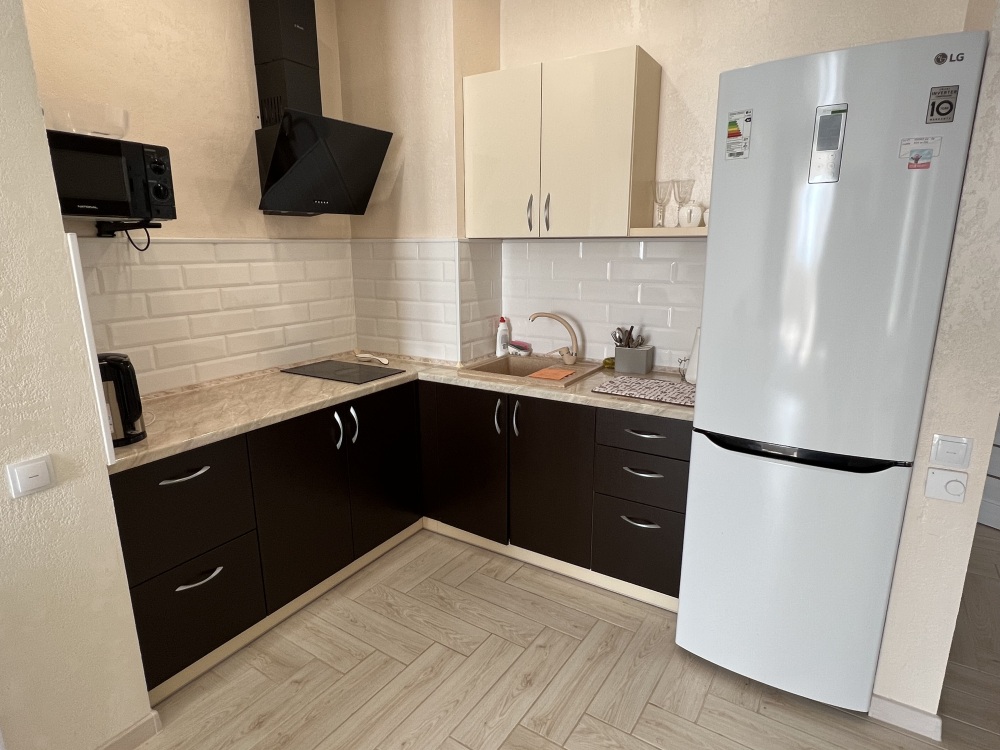 Кухня полностью оснащена необходимой посудой, техникой (холодильник, эл.плита, микроволновка, эл. чайник).