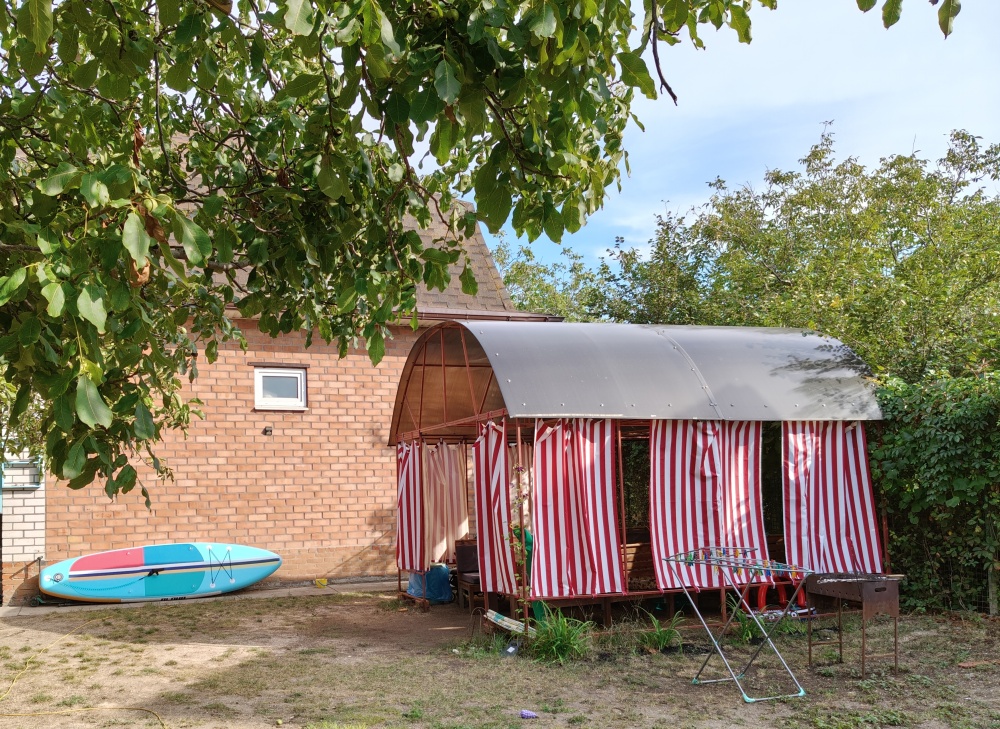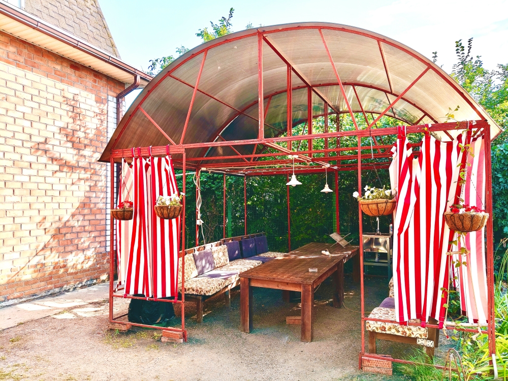 На улице своя беседка со столом и лавками, мангалом, раковиной и посудой, где можно покушать на свежем воздухе и пожарить шашлыки.