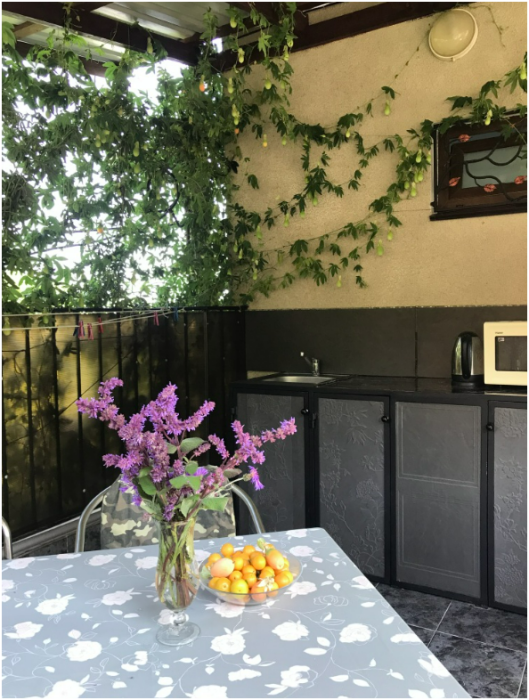 Великолепный вид из номера. К номеру примыкает ЗАКРЫТАЯ площадка с кухней (только для Вашего номера), шезлонгом и столиком со стульями, с которой открывается вид как на гору Ай-Петри, так и на море. Есть все необходимое для приготовления пищи. Особенность номера-вход по лестнице.