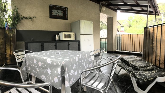 Номер оформлен деревом, К номеру примыкают 2 площадки (одна с дастарханом). Вход в номер по ступенькам. Стиральная машинка и кухня находятся ниже на площадке.