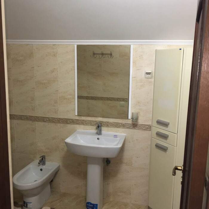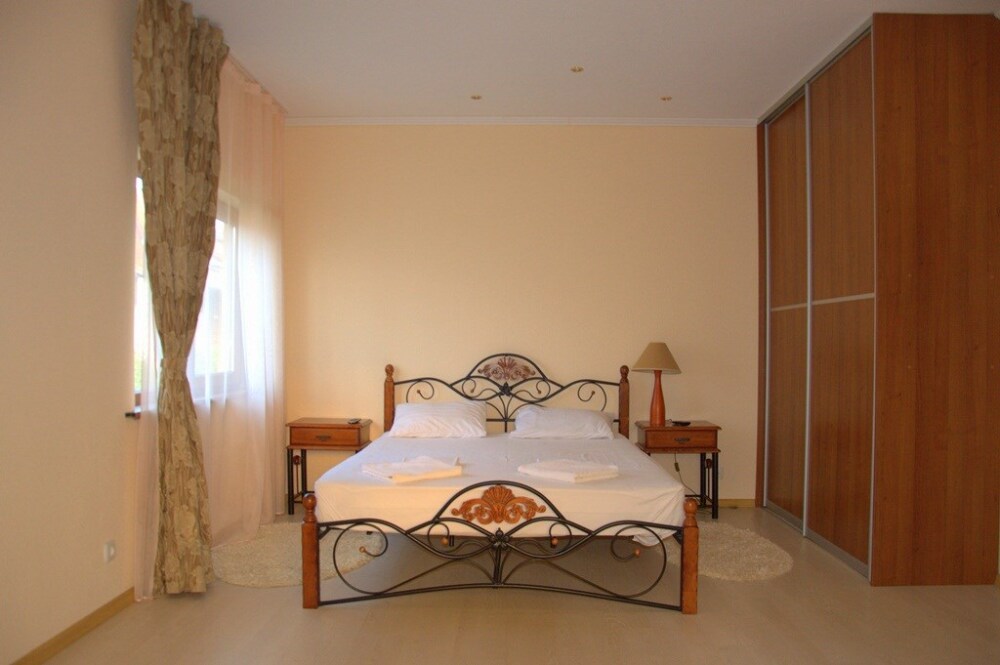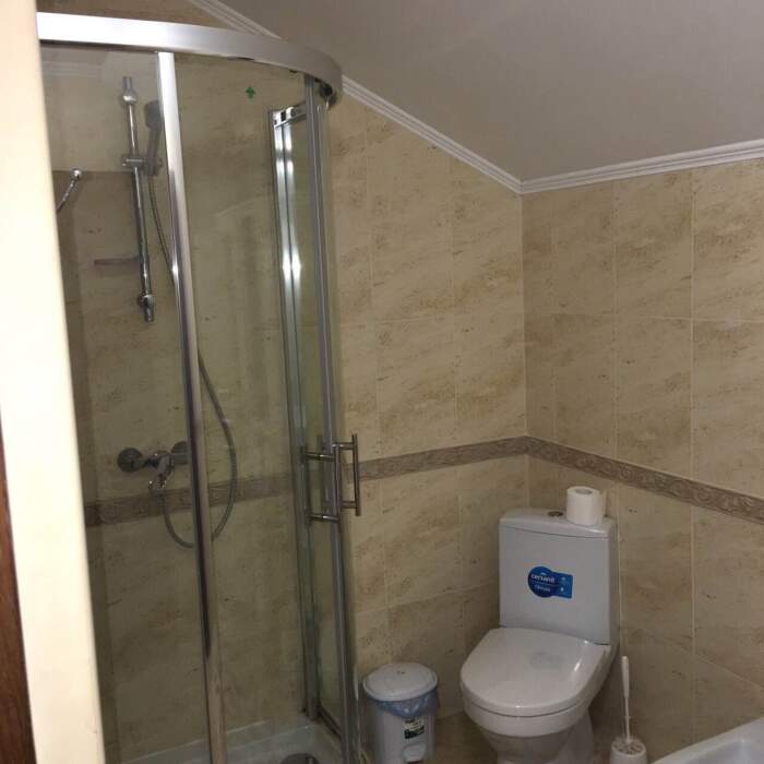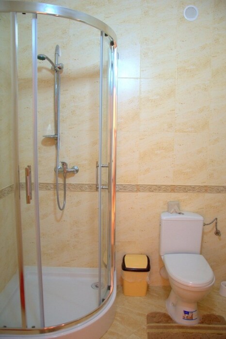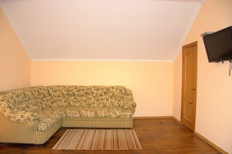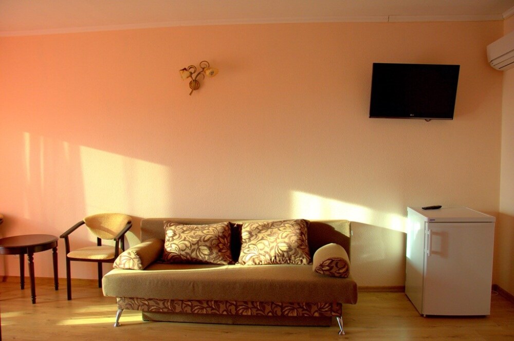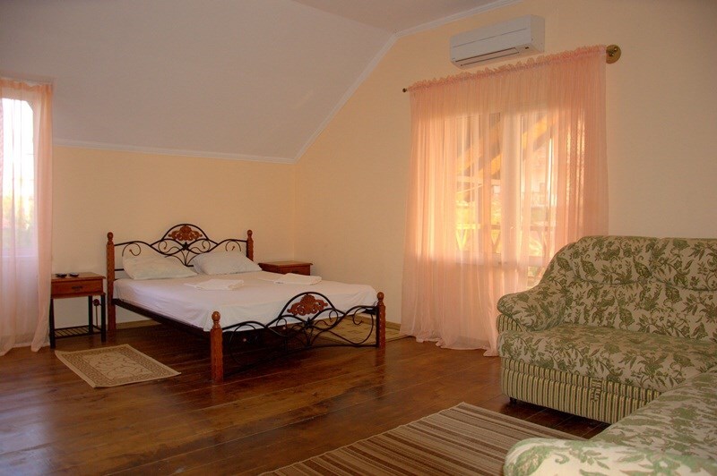Отдельно стоящий двухэтажных дом. На 1 этаже с собственной зоной отдыха: беседка, мангал. На 2 этаже с видом на море, балкон 20 кв м, мебель, отдельный вход. Номер трёхкомнатный: кухня-гостиная с полным набором посуды, СВЧ, электроплита, чайник, двухкамерный холодильник, обеденный стол, кондиционер, smart TV, угловой раскладывающихся диван, шкаф купе. Две спальни: в одной двухспальная кровать, в другой - две односпальные. Санузел: унитаз, биде, умывальник, душ, шкаф, фен, гигиенические принадлежности, полотенца, халаты.