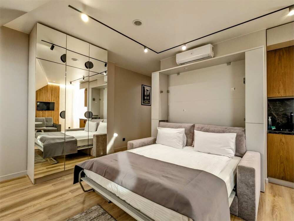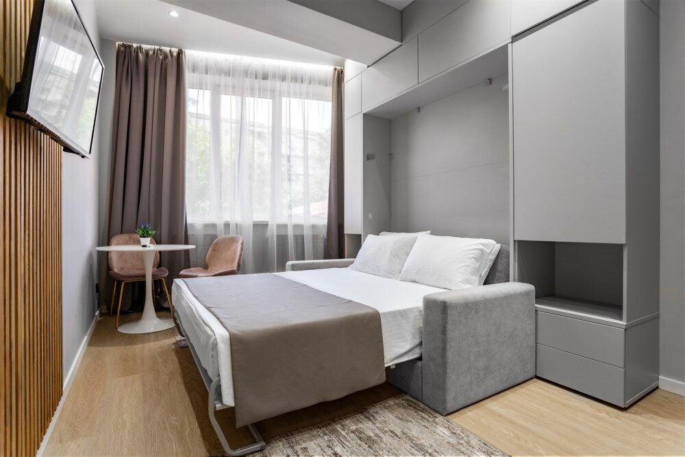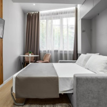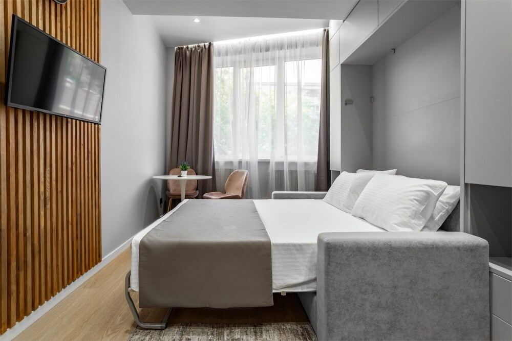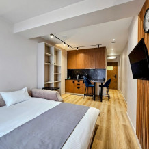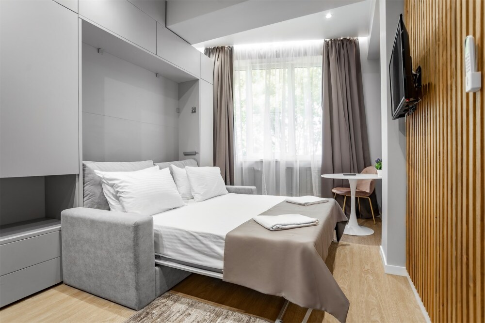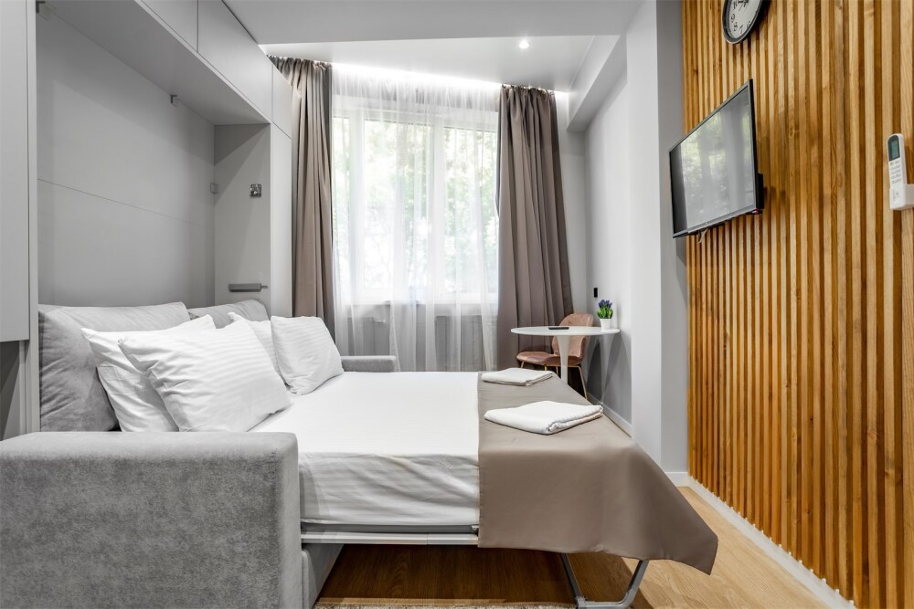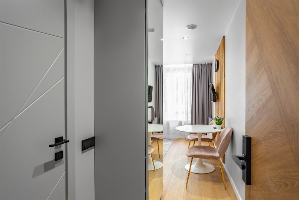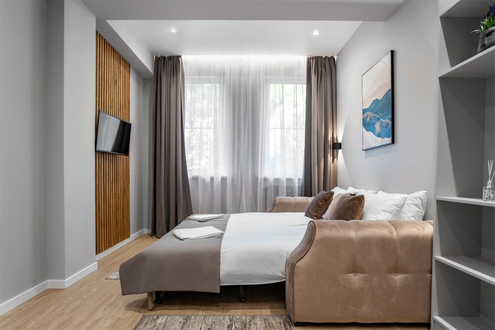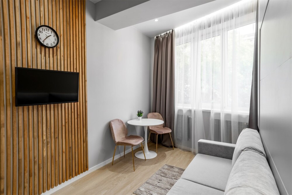 Каждый номер оформлен по персональному дизайн-проекту в стиле европейской классики. Полная комплектация современной мебелью и бытовой техникой для комфортного проживания.