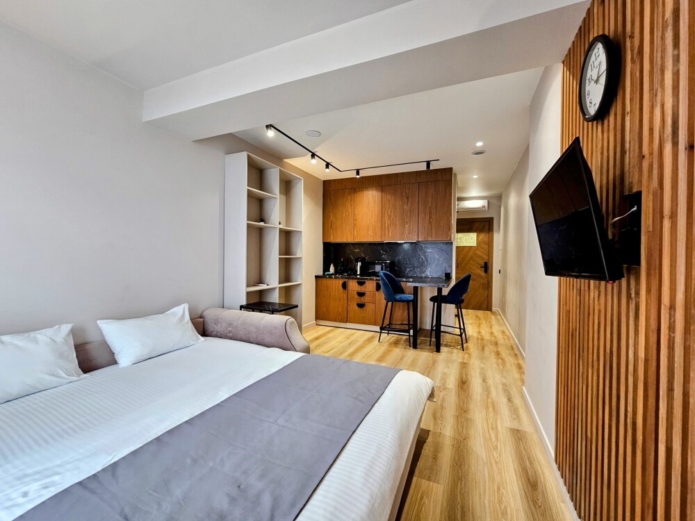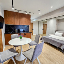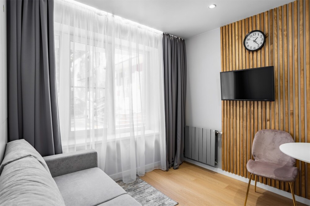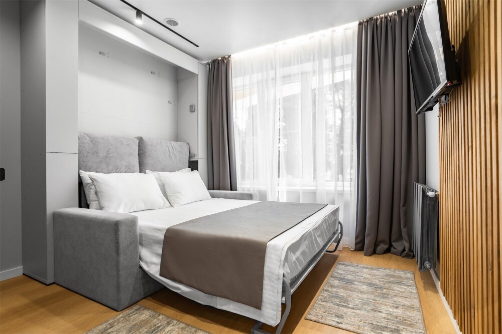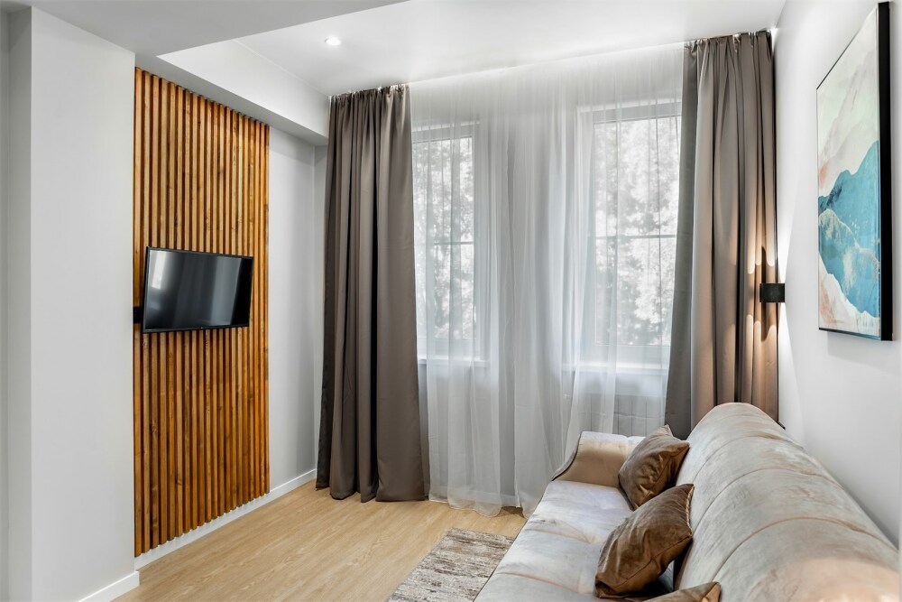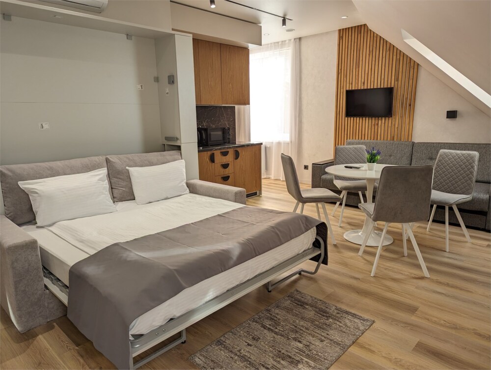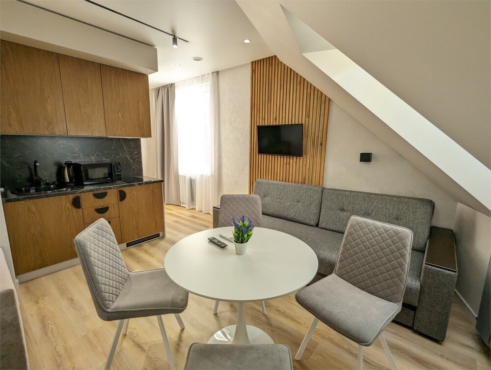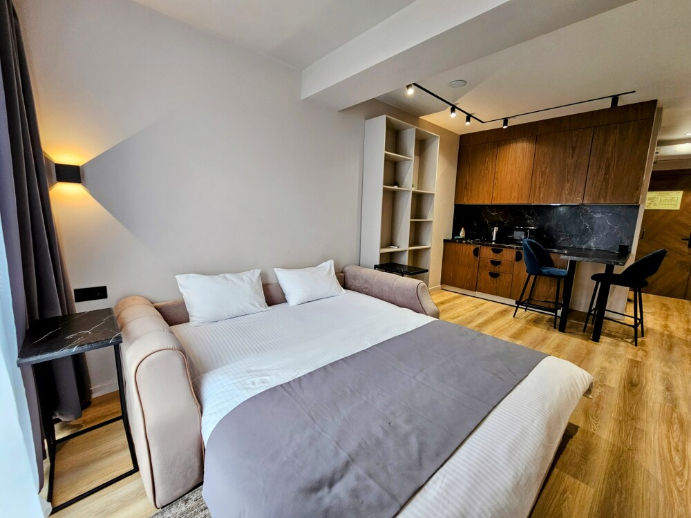 Каждый номер оформлен по персональному дизайн-проекту в стиле европейской классики. Полная комплектация современной мебелью и бытовой техникой для комфортного проживания.