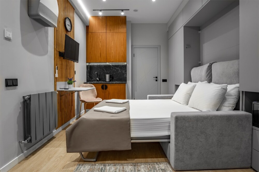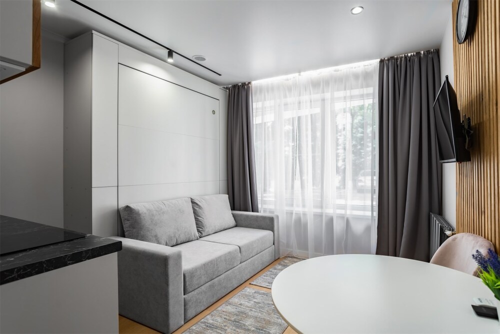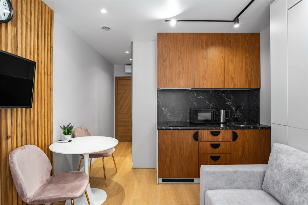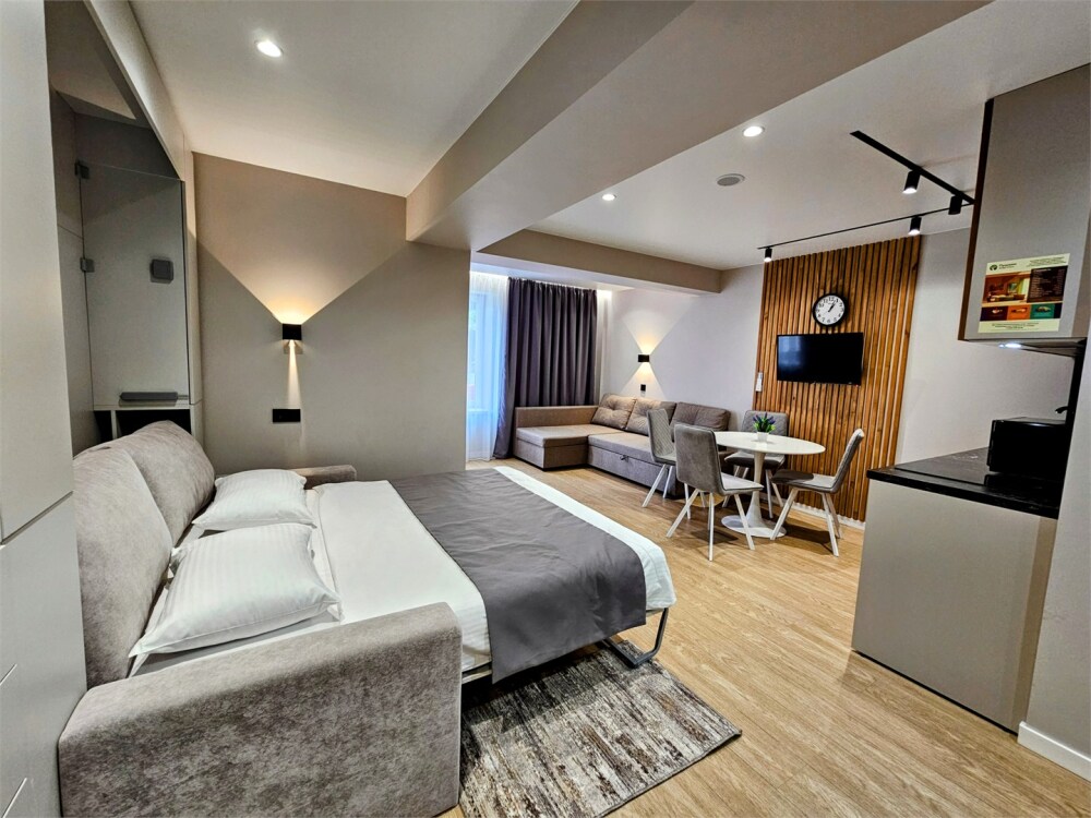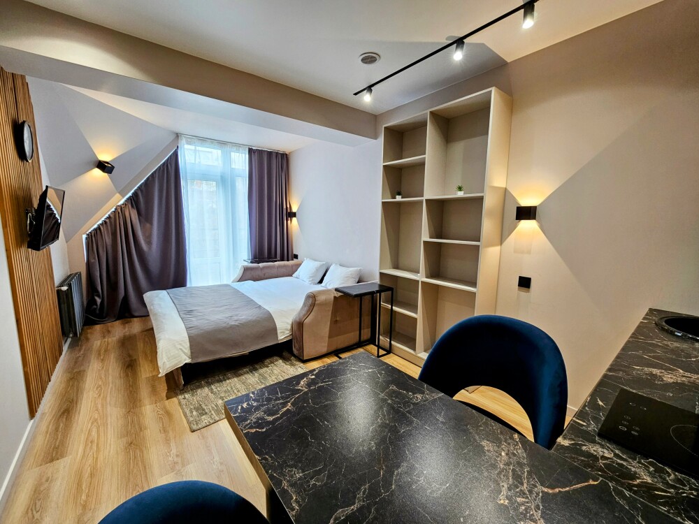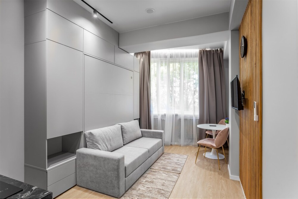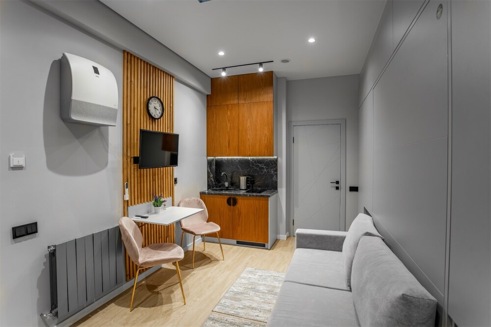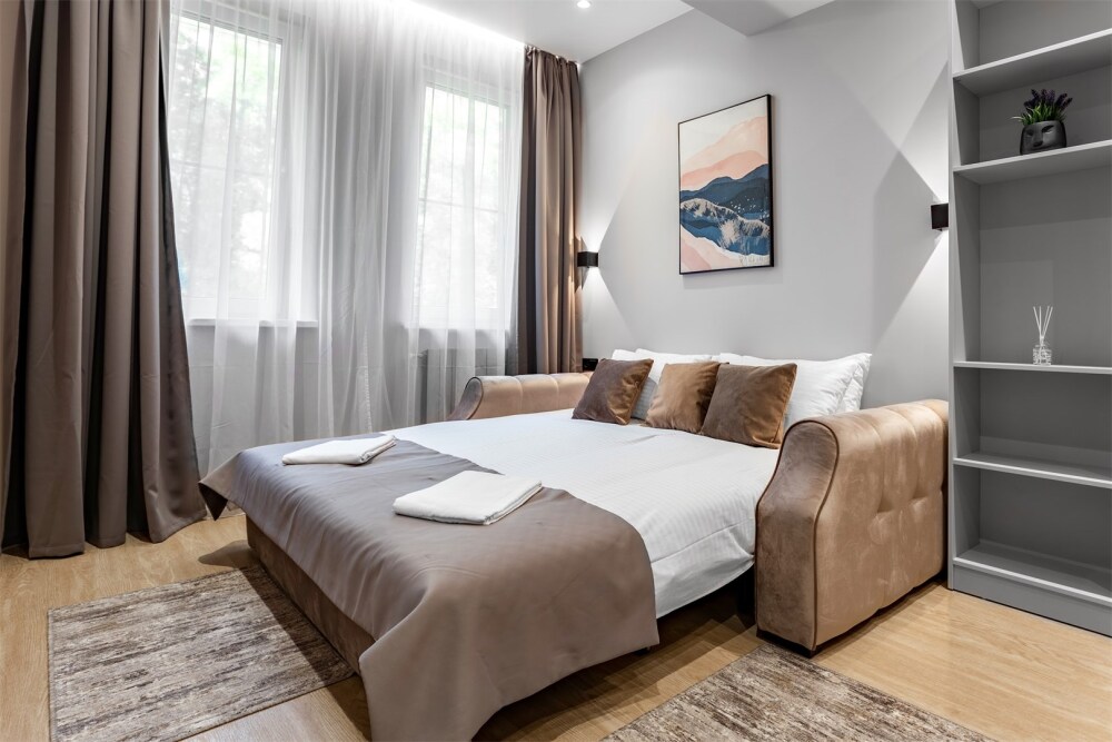 Каждый номер оформлен по персональному дизайн-проекту в стиле европейской классики. Полная комплектация современной мебелью и бытовой техникой для комфортного проживания.