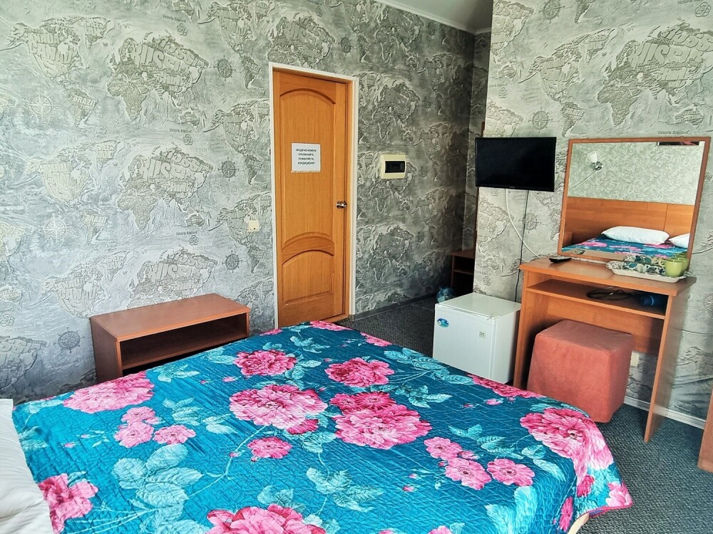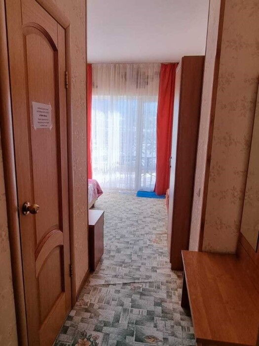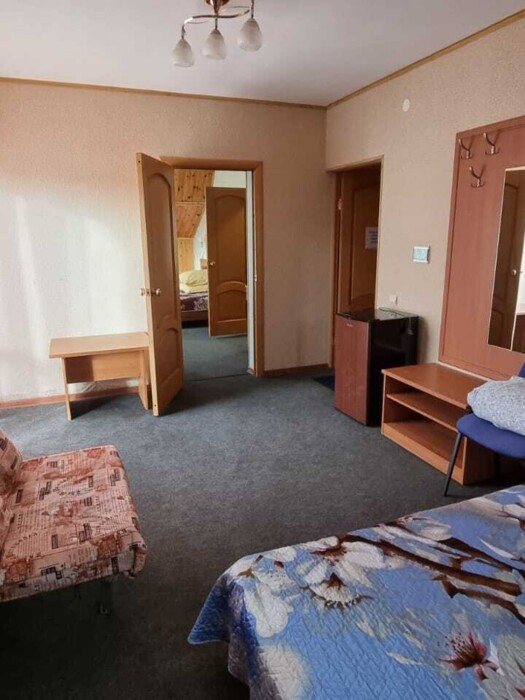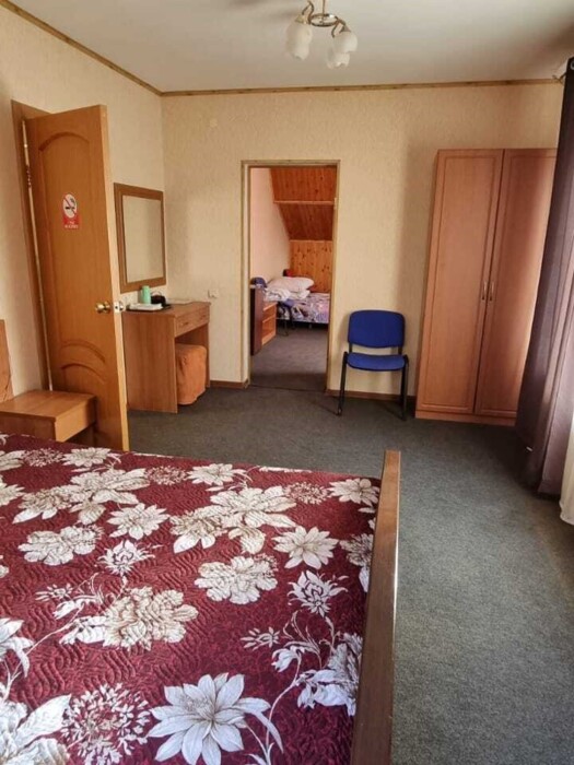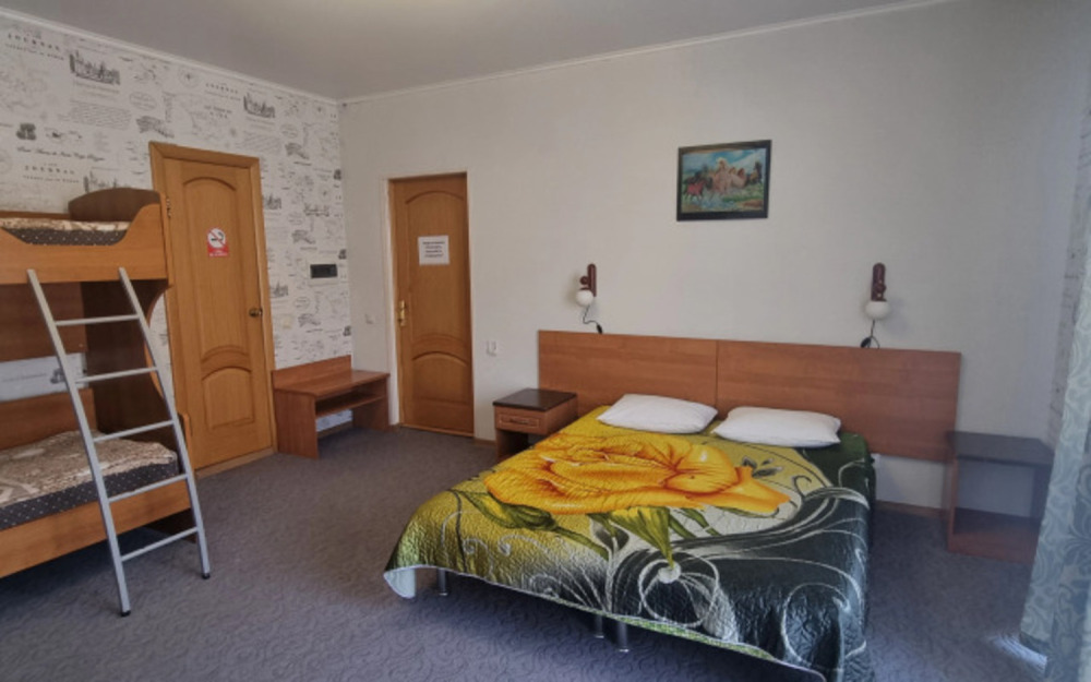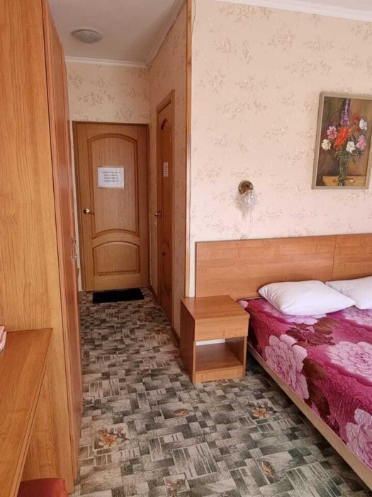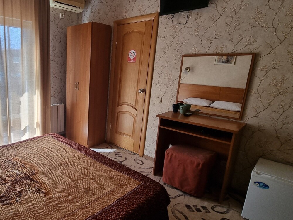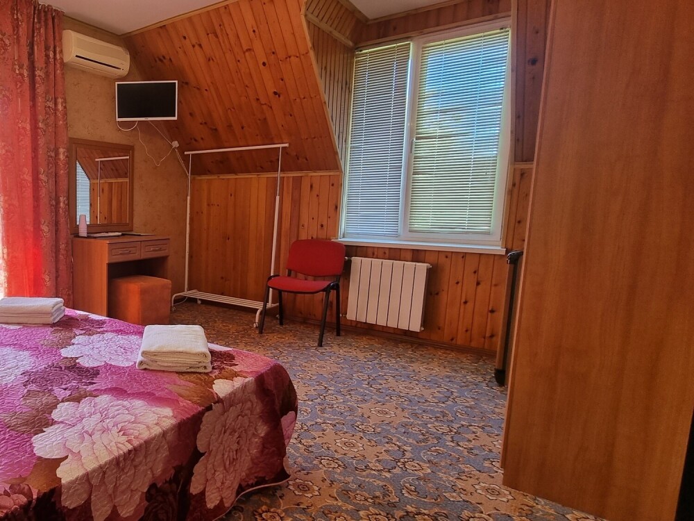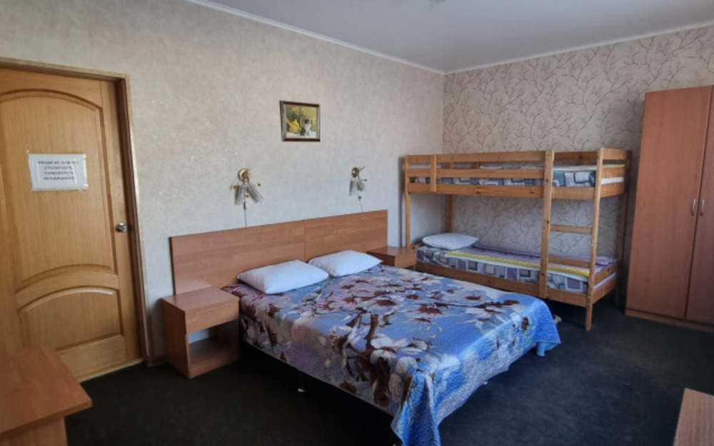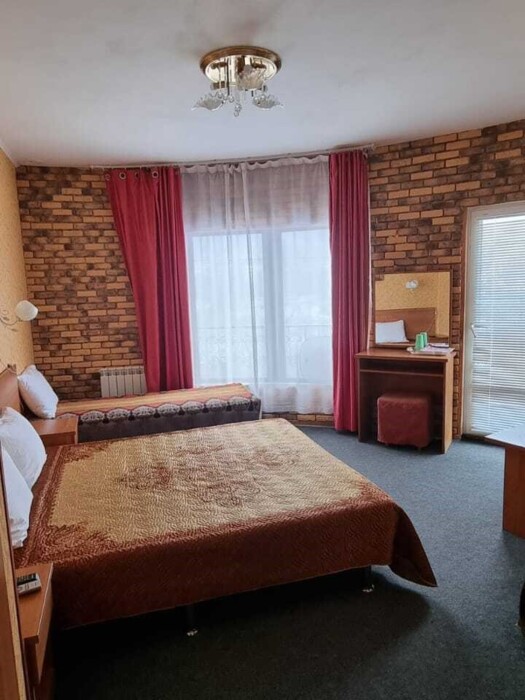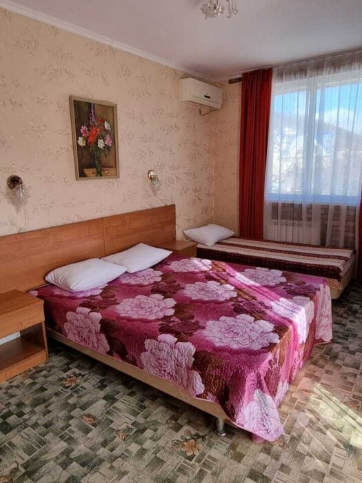 В номере: двуспальная и односпальная кровати, шкаф, стол, стул, тумбочки, телевизор, фен, кондиционер, холодильник на этаже.