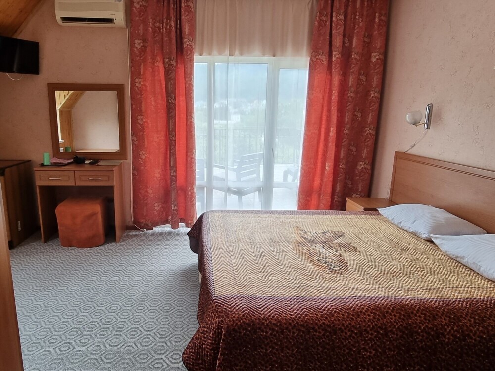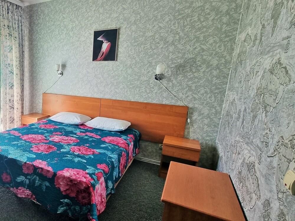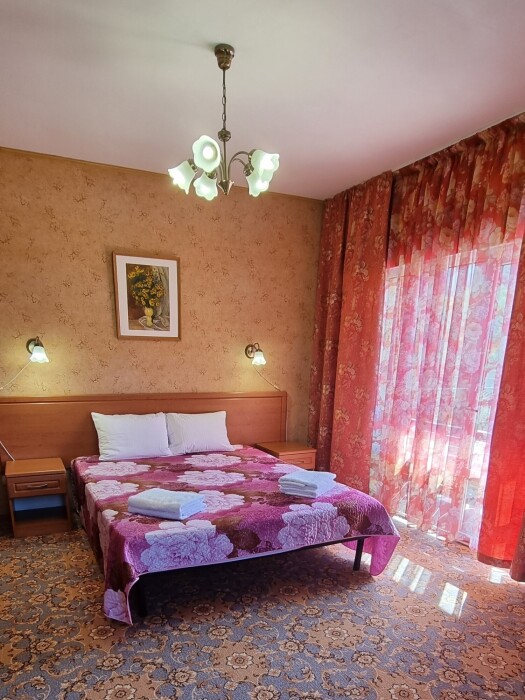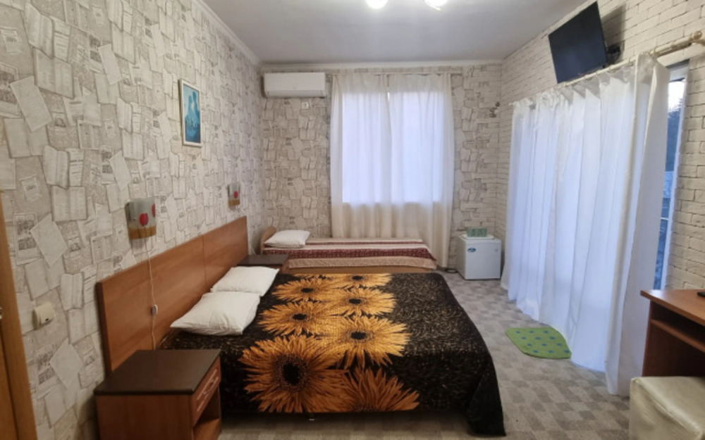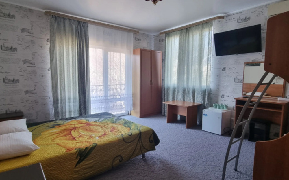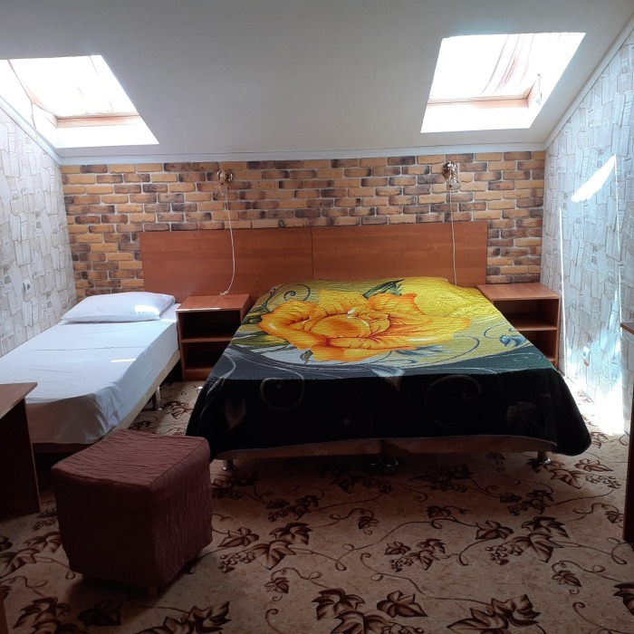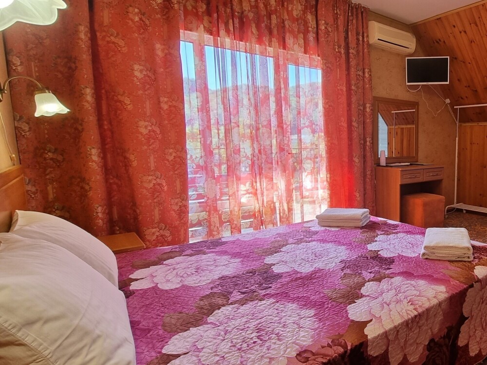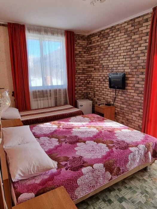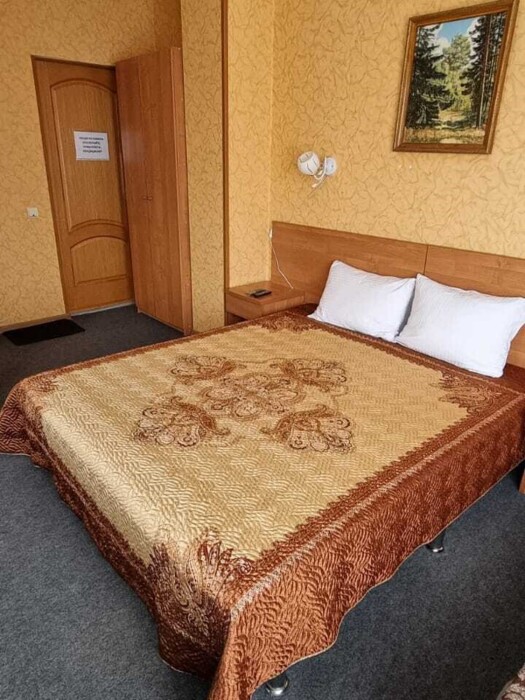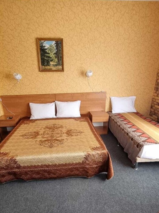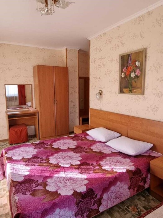 В номере: двуспальная и односпальная кровати, шкаф, стол, стул, тумбочки, телевизор, фен, кондиционер, холодильник на этаже.
