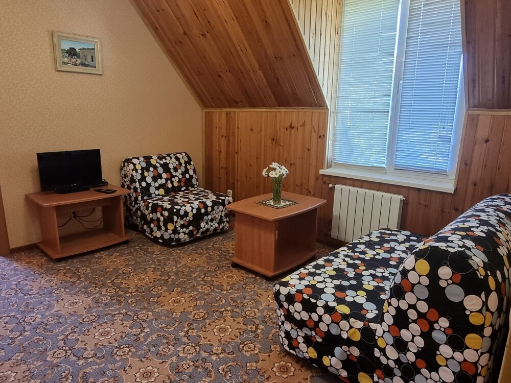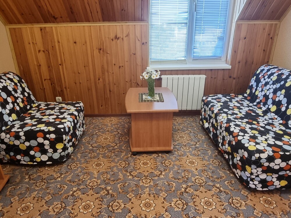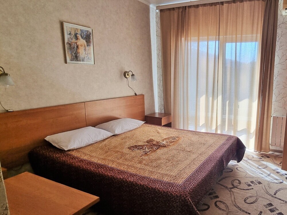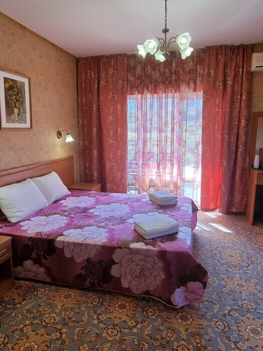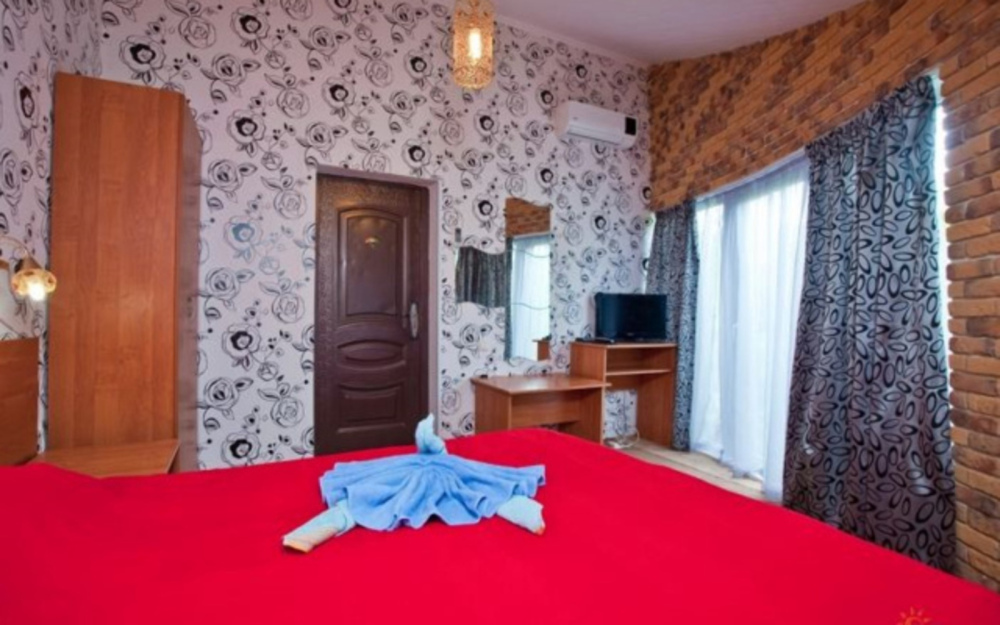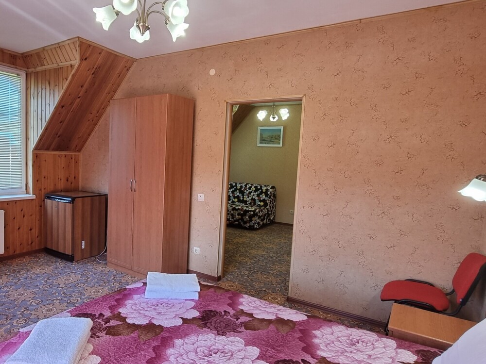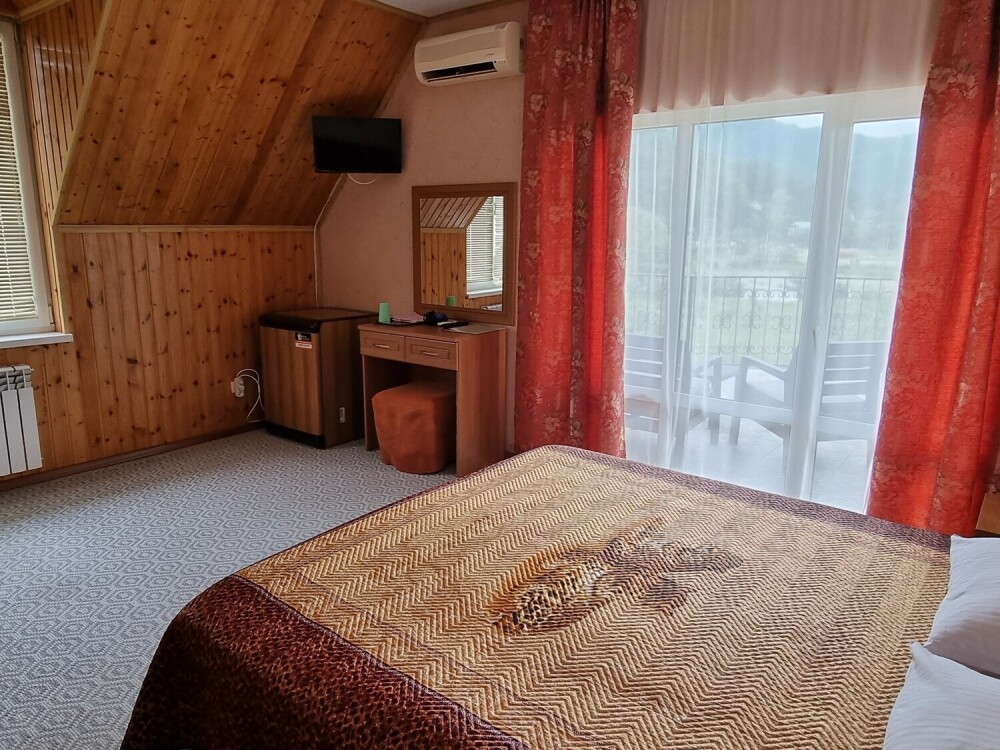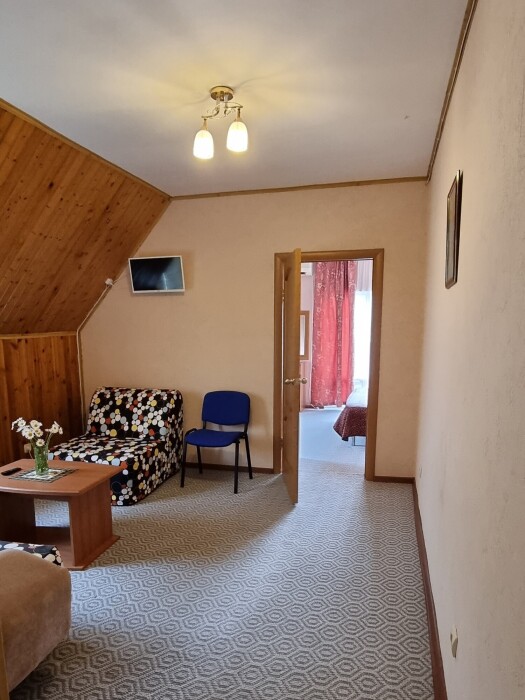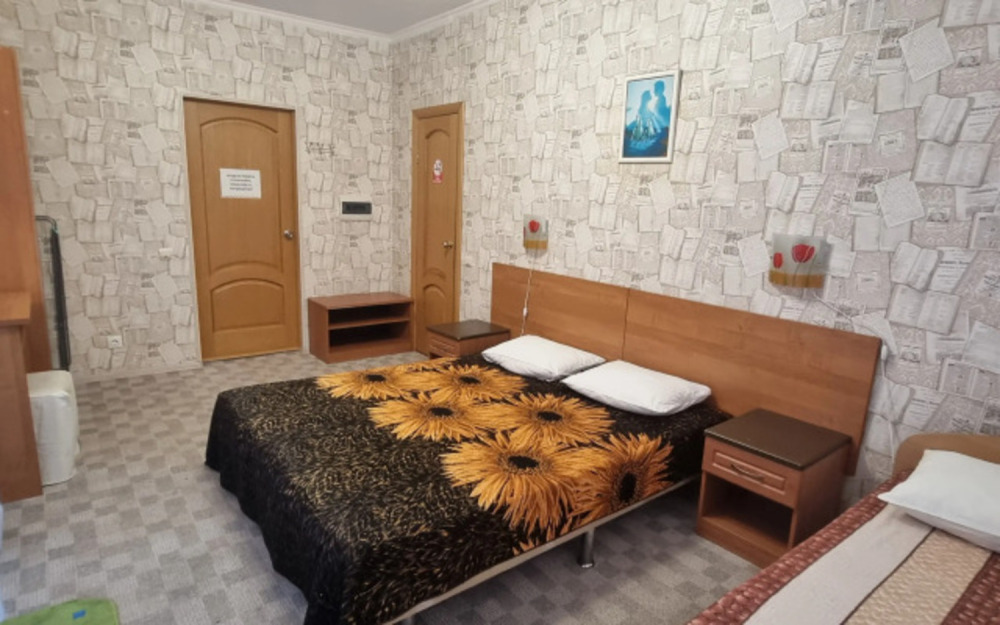В номере: двуспальная и односпальная кровати, шкаф, стол, стул, тумбочки, телевизор, фен, кондиционер, холодильник на этаже.