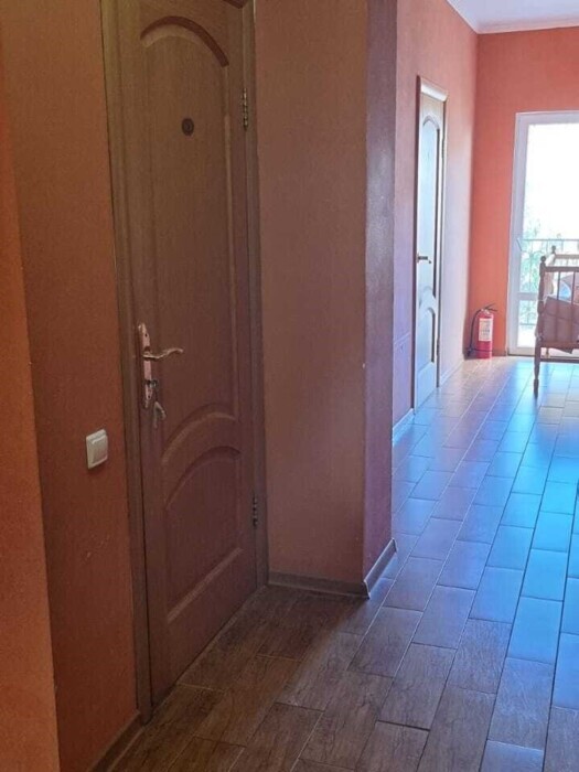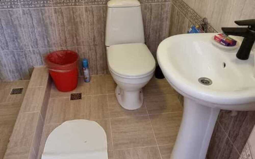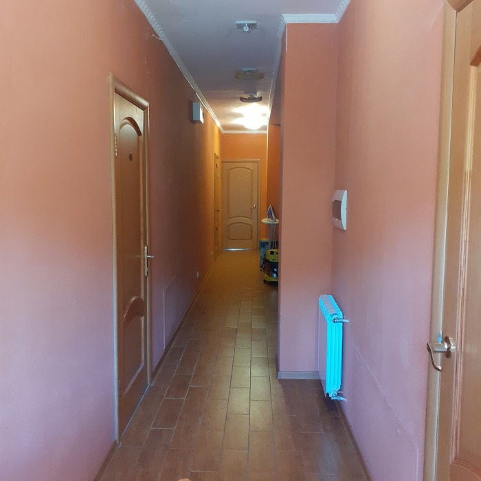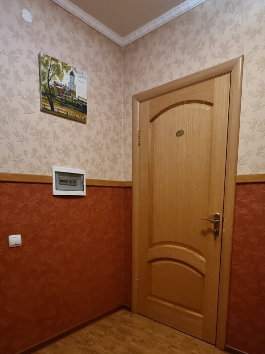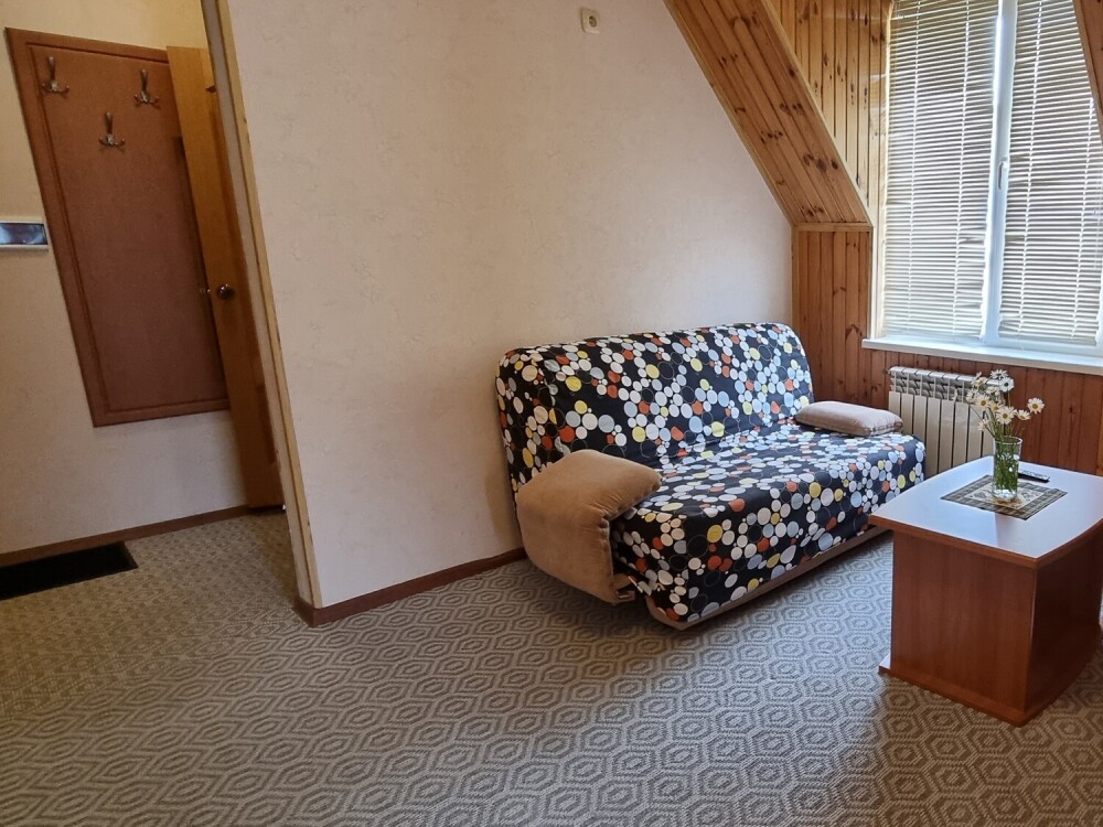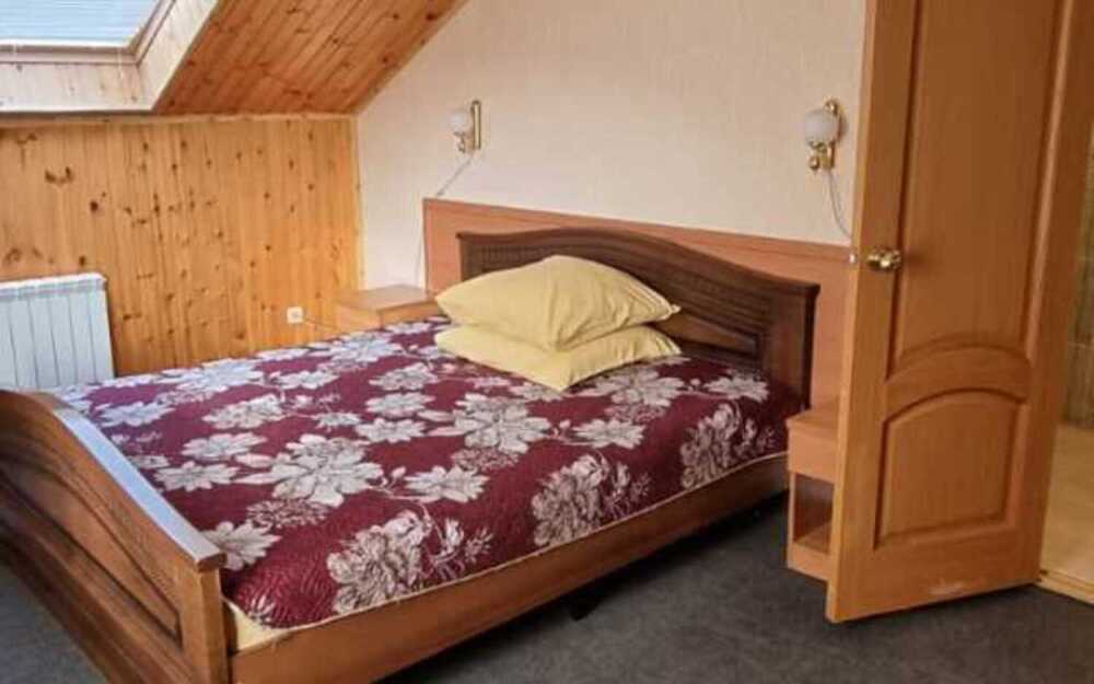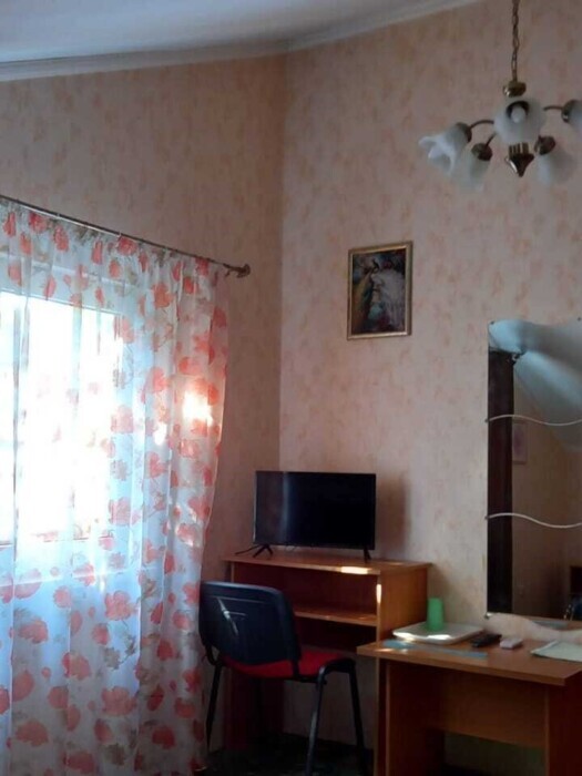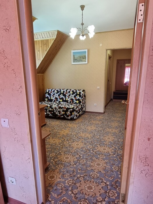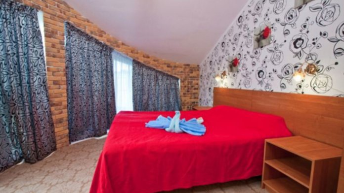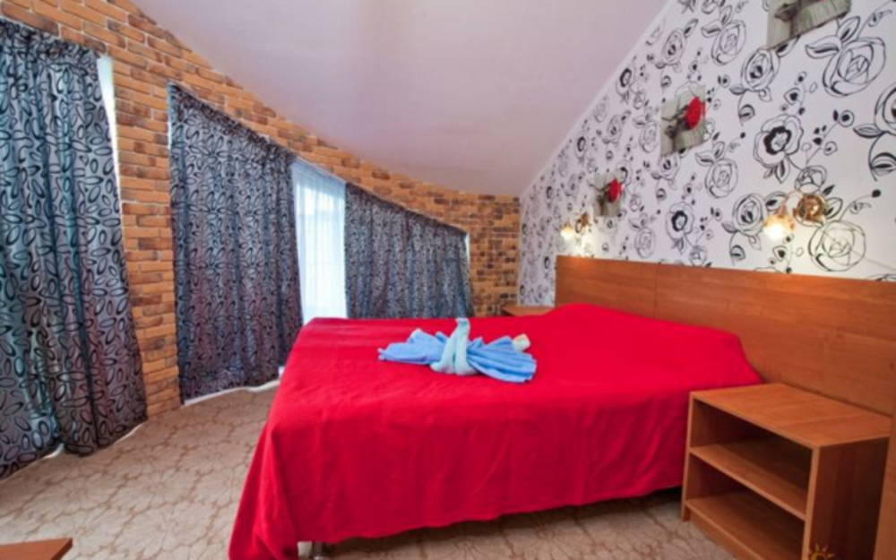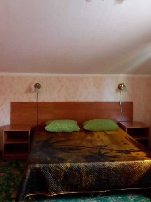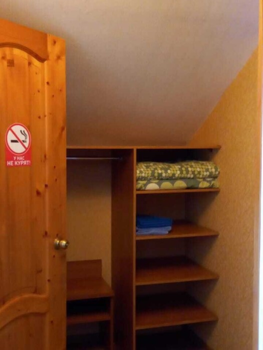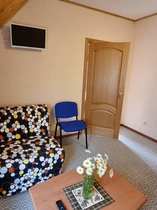 В номере: двуспальная и односпальная кровати, шкаф, стол, стул, тумбочки, телевизор, фен, кондиционер, холодильник на этаже.