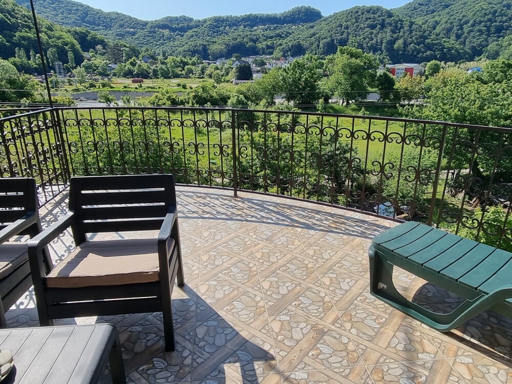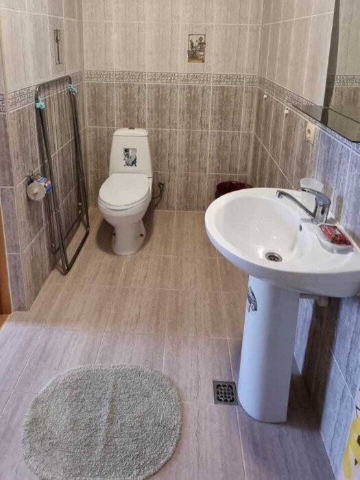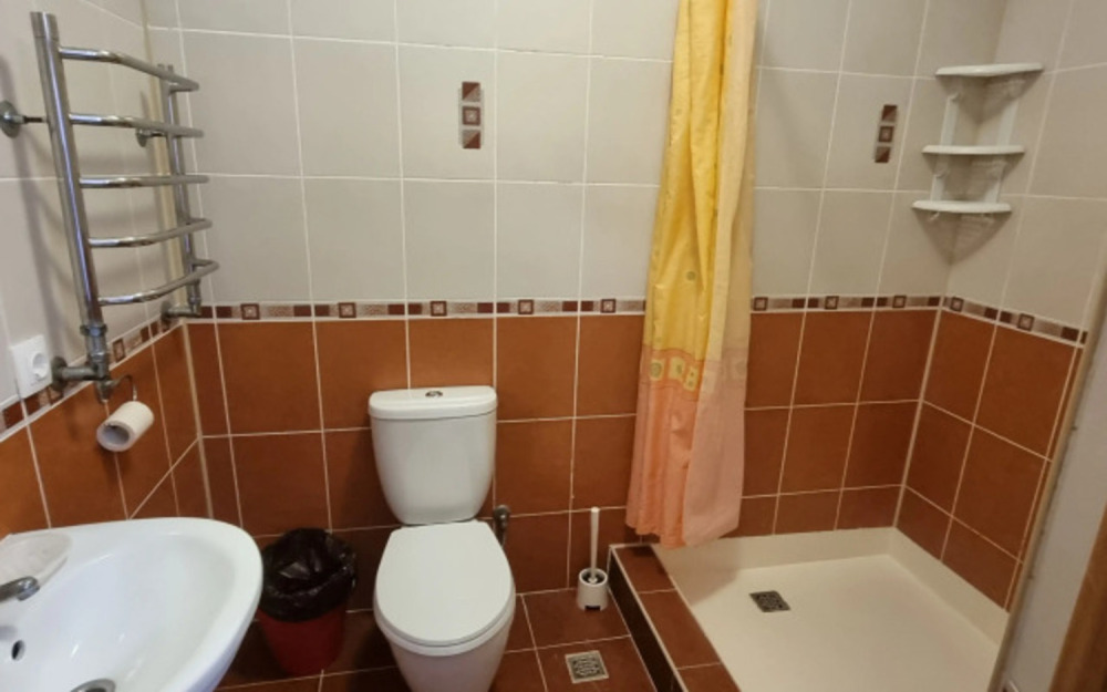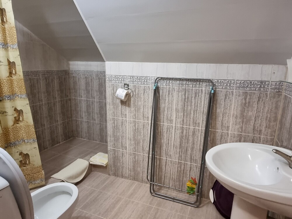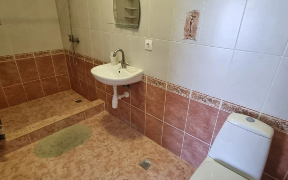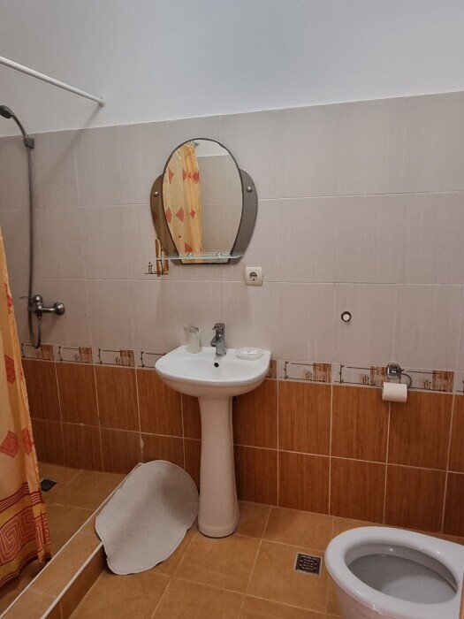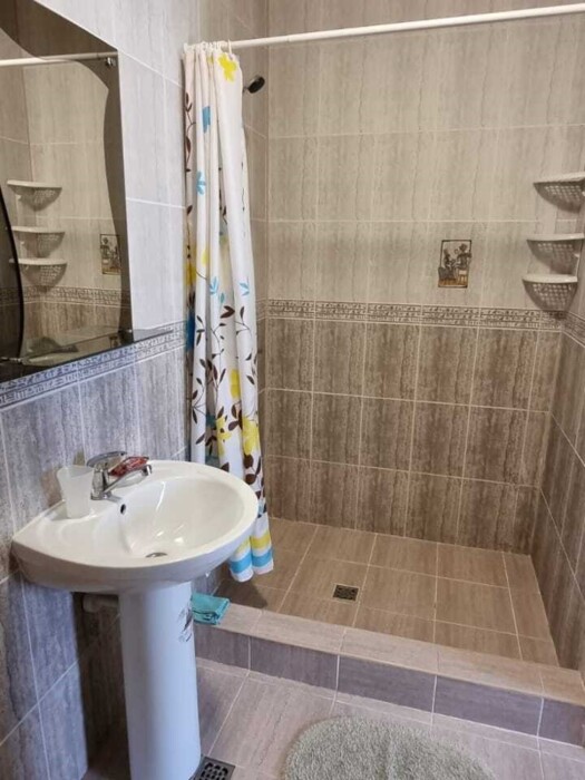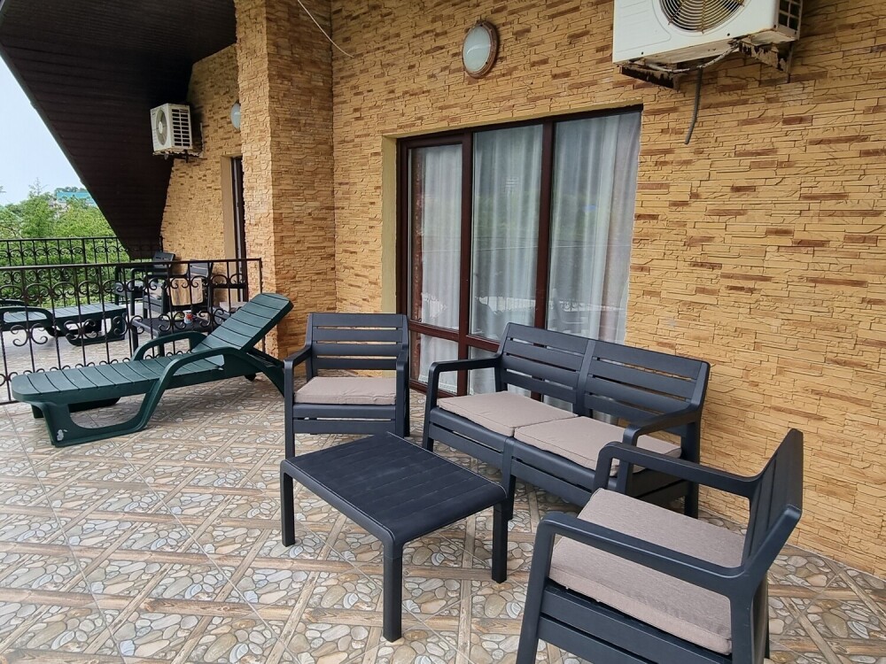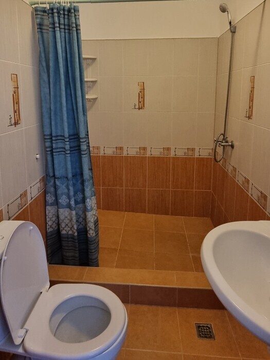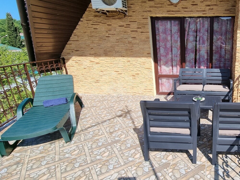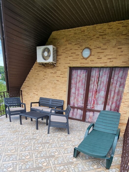 Санузел совмещенный с душем, терраса с уличной мебелью.