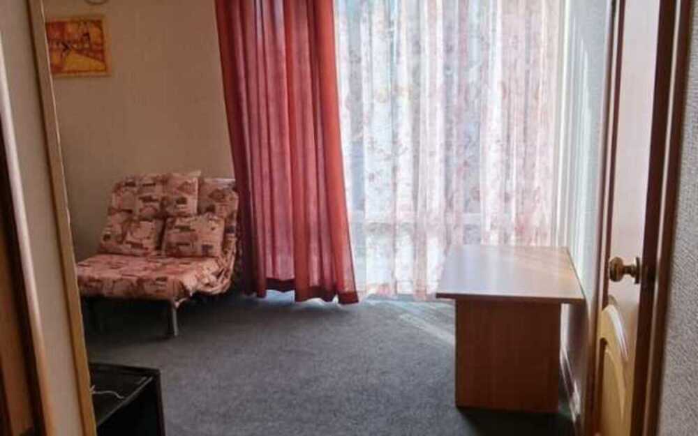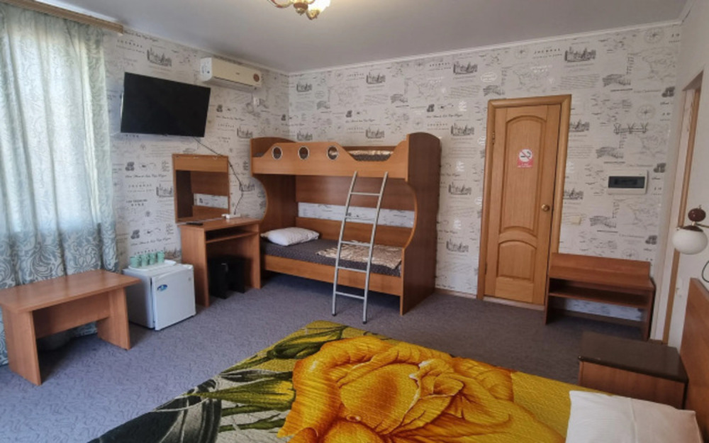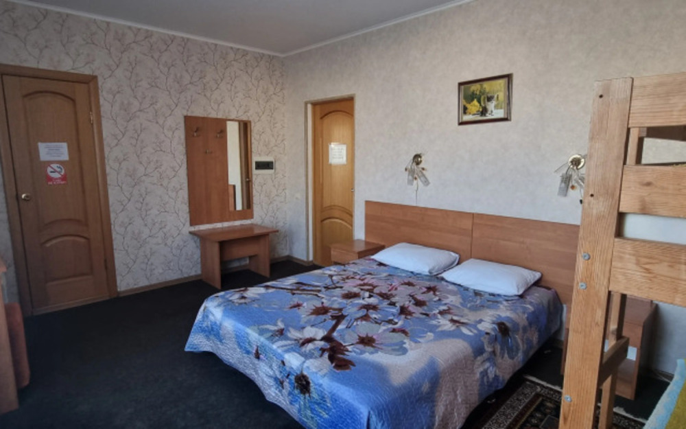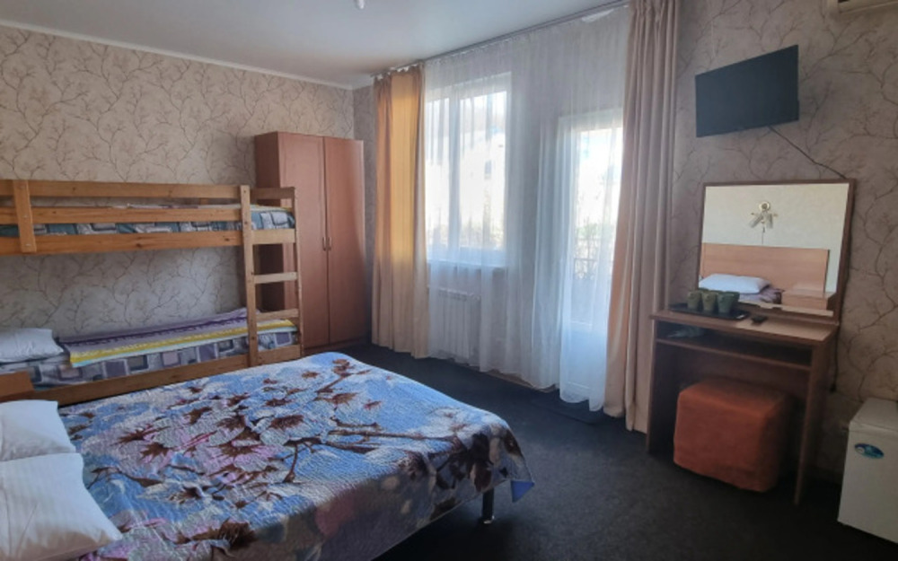 В комнате: двуспальная и двухъярусная кровати, телевизор, кондиционер, холодильник, туалетный столик, шкаф, пуф, плотные занавески, фен.