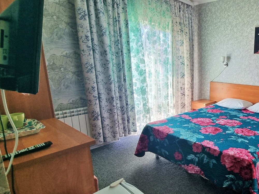 В комнате: двуспальная кровать, телевизор, кондиционер, холодильник на этаже, журнальный стол, шкаф, пуф, плотные занавески, фен.