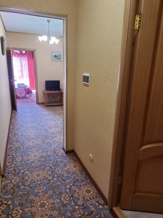 В номере: 1 комната - двуспальная кровать, шкаф, туалетный столик, тумбочки, телевизор, фен, 2 комната - двуспальный диван-кровать, односпальное кресло-кровать, телевизор, кондиционер, холодильник, стол, стулья, вешалка напольная для одежды с полками.