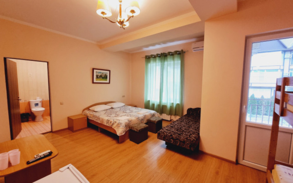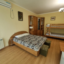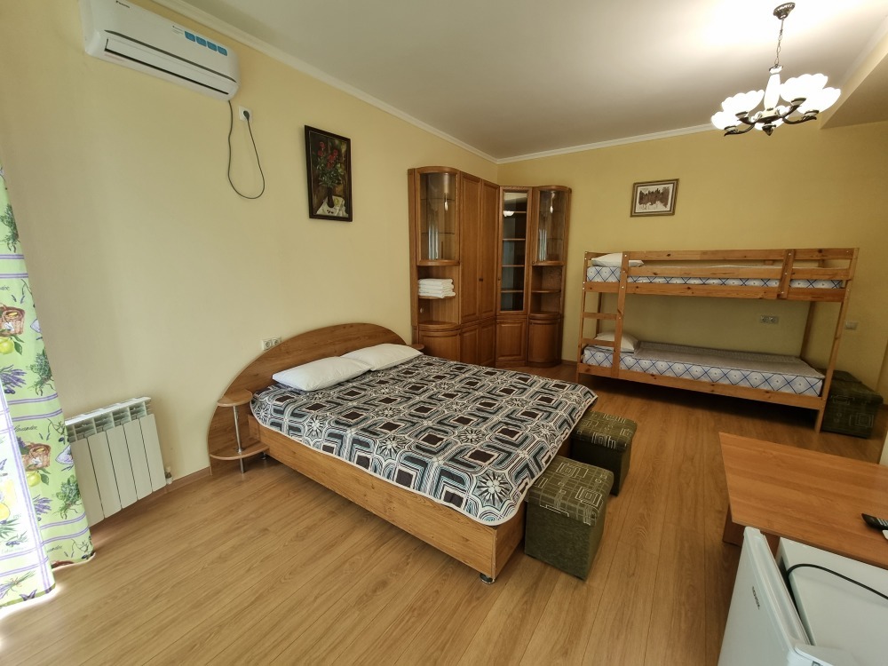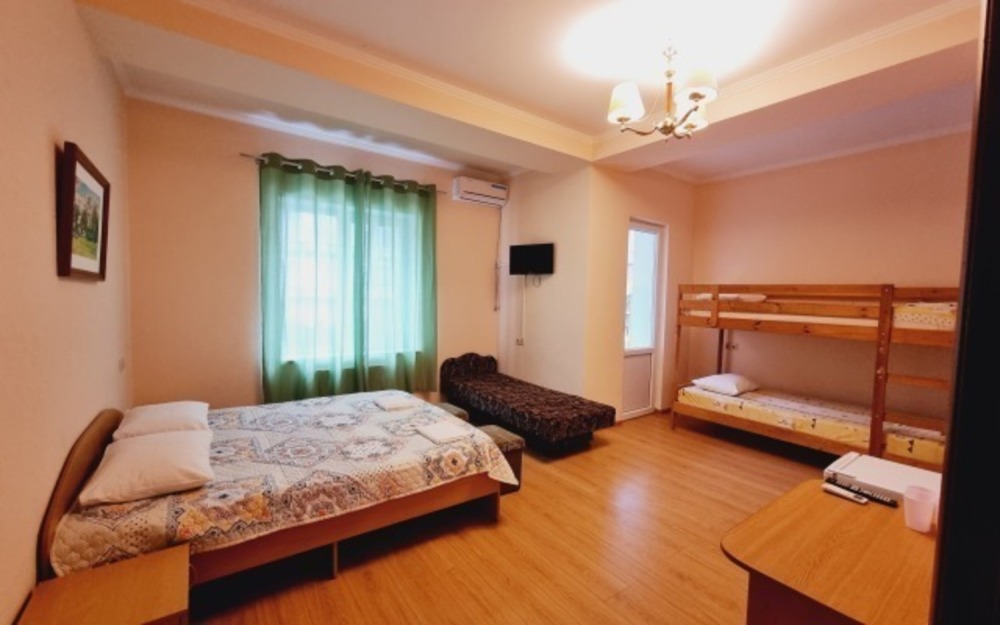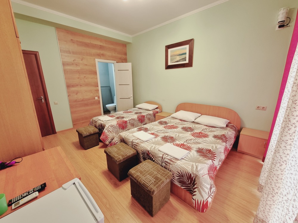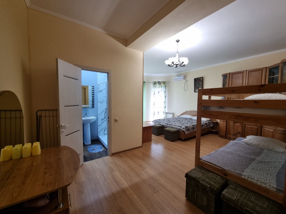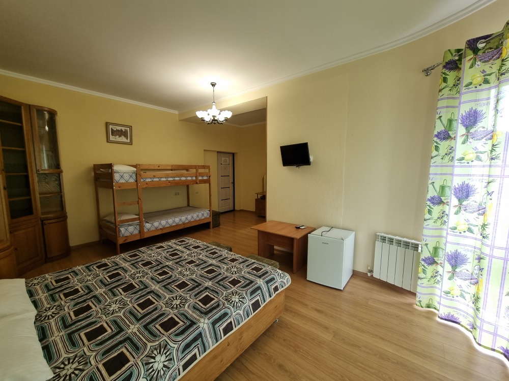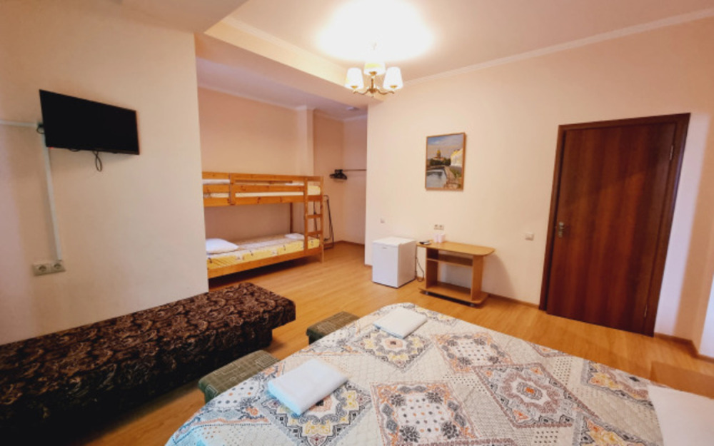 В номере: двуспальная кровать, двухъярусная кровать, телевизор, кондиционер, холодильник, журнальный стол, гардеробная, тумбочки, пуфики, плотные занавески, фен, 2 этаж, балкон. Санузел совмещенный с душем в номере.