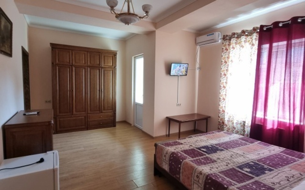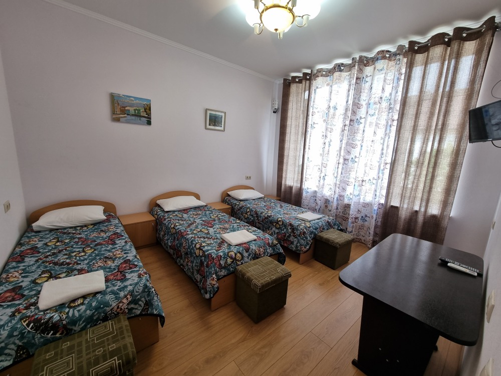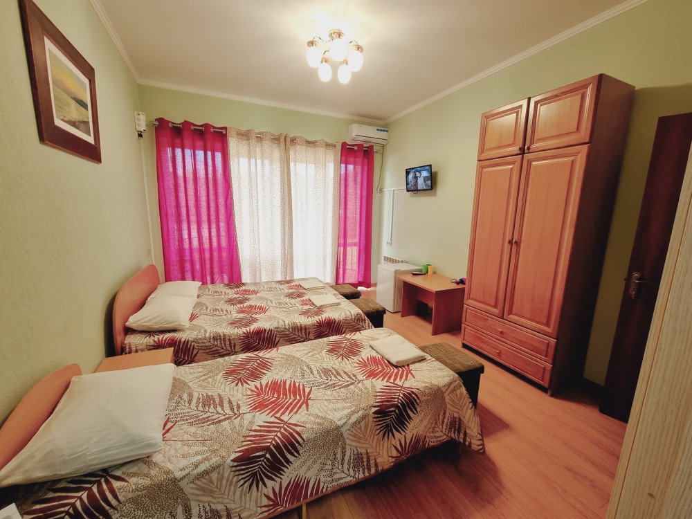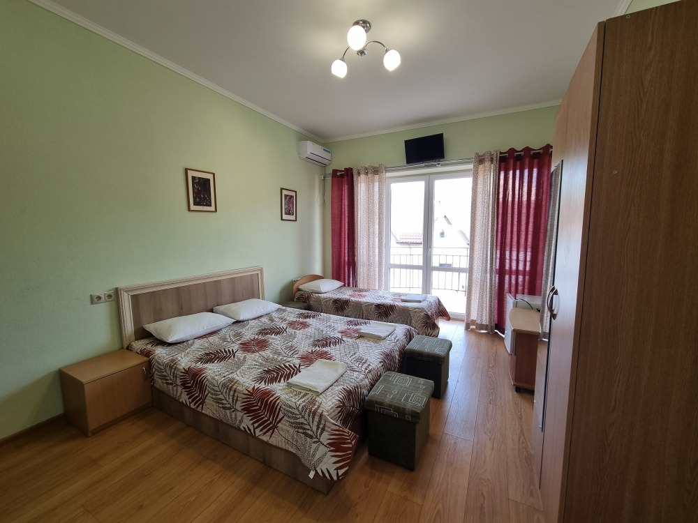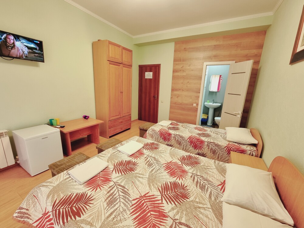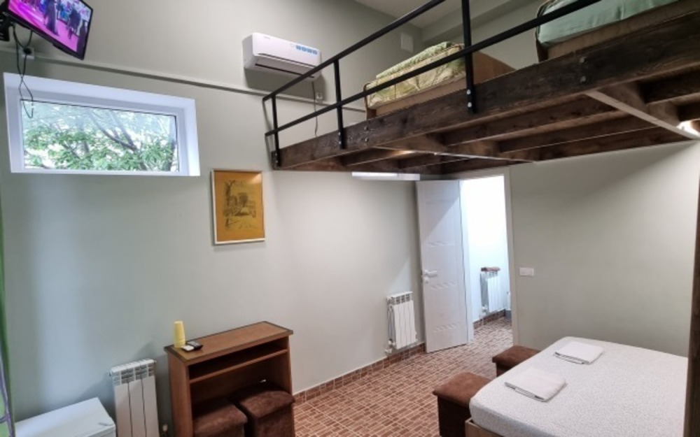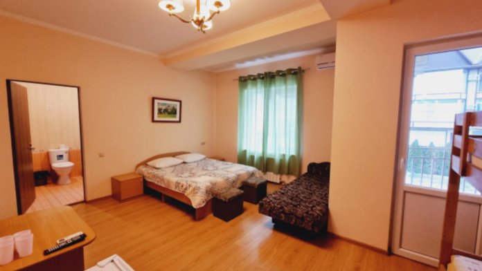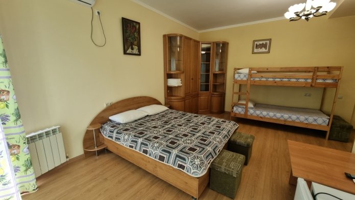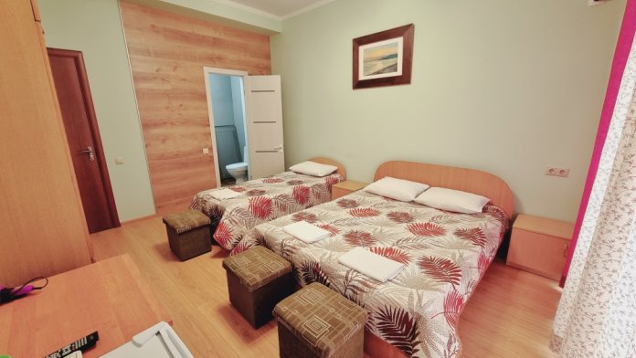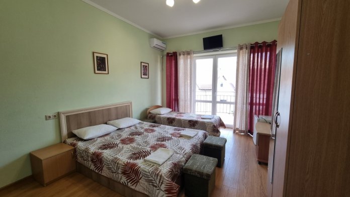 В номере: двуспальная кровать, двухъярусная кровать, телевизор, кондиционер, холодильник, журнальный стол, гардеробная, тумбочки, пуфики, плотные занавески, фен, 2 этаж, балкон. Санузел совмещенный с душем в номере.