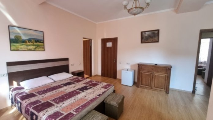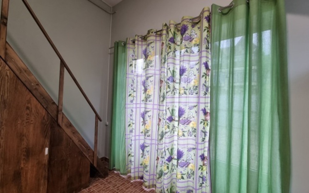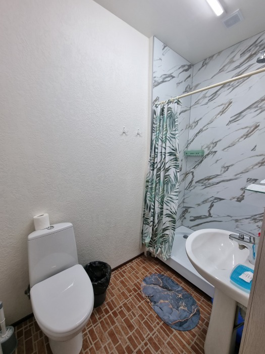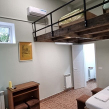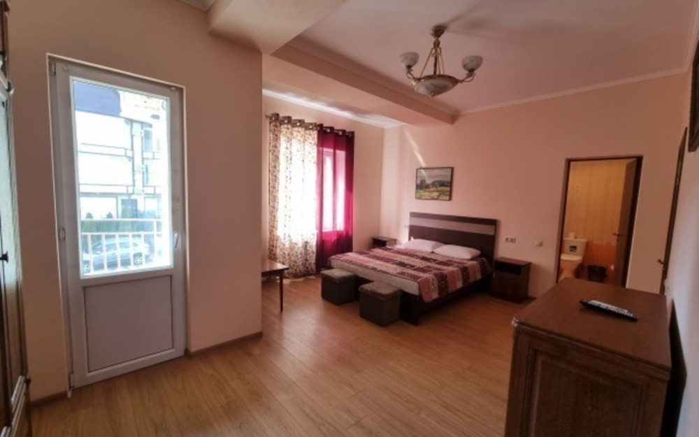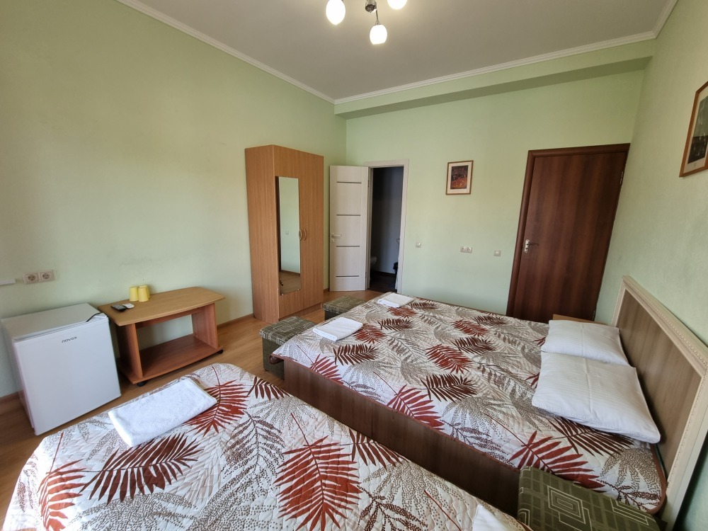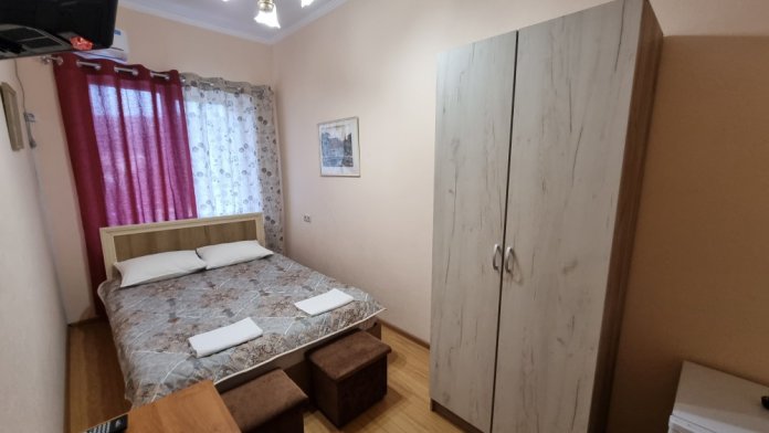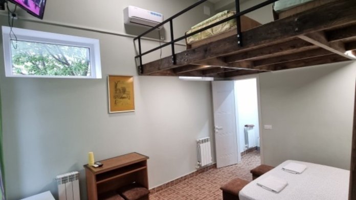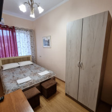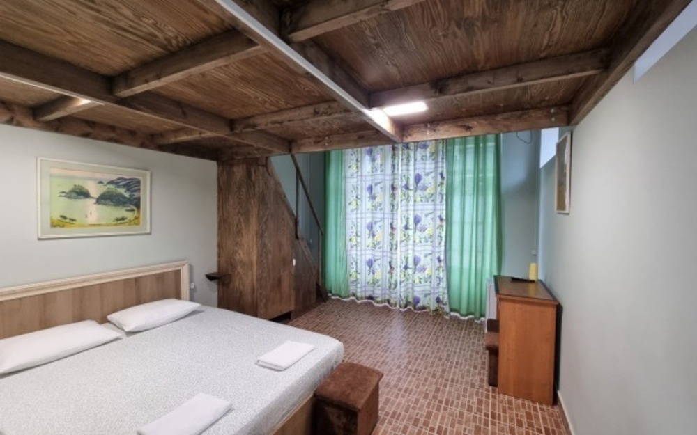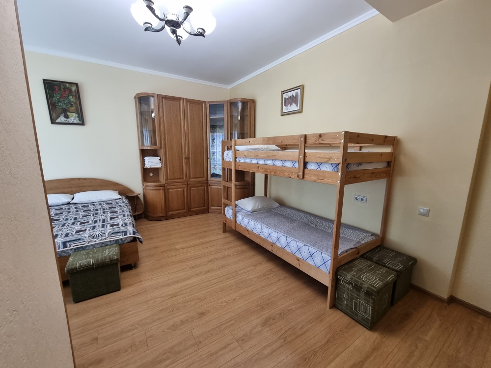 В номере: двуспальная кровать, двухъярусная кровать, телевизор, кондиционер, холодильник, журнальный стол, гардеробная, тумбочки, пуфики, плотные занавески, фен, 2 этаж, балкон. Санузел совмещенный с душем в номере.