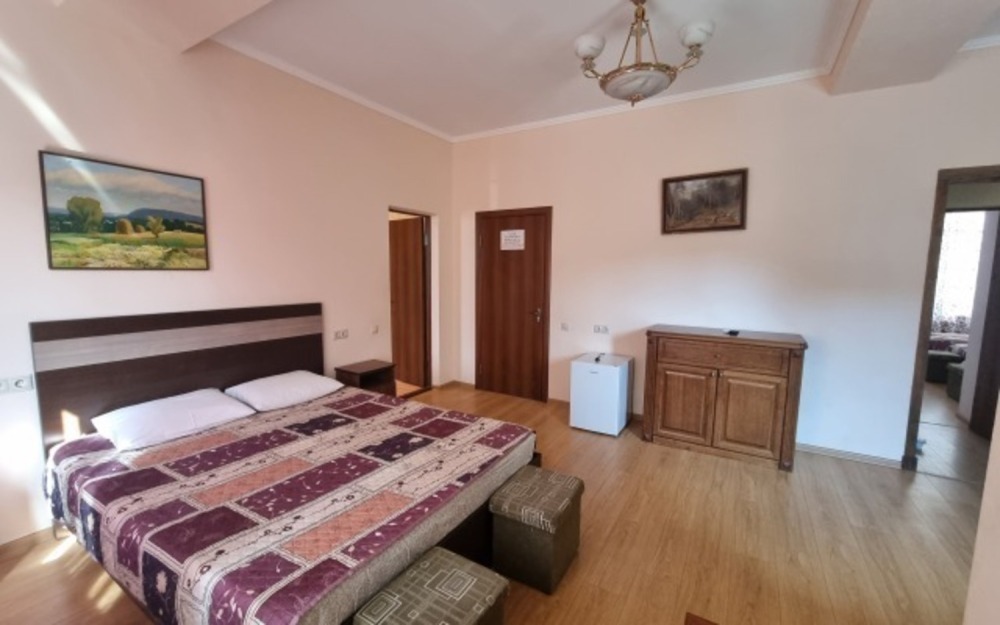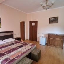 В номере: двуспальная кровать, односпальная кровать, телевизор, кондиционер, холодильник, журнальный стол, набор уличной мебели на балконе, шкаф, тумбочки, пуфики, плотные занавески, фен, балкон. Санузел совмещенный с душем в номере.