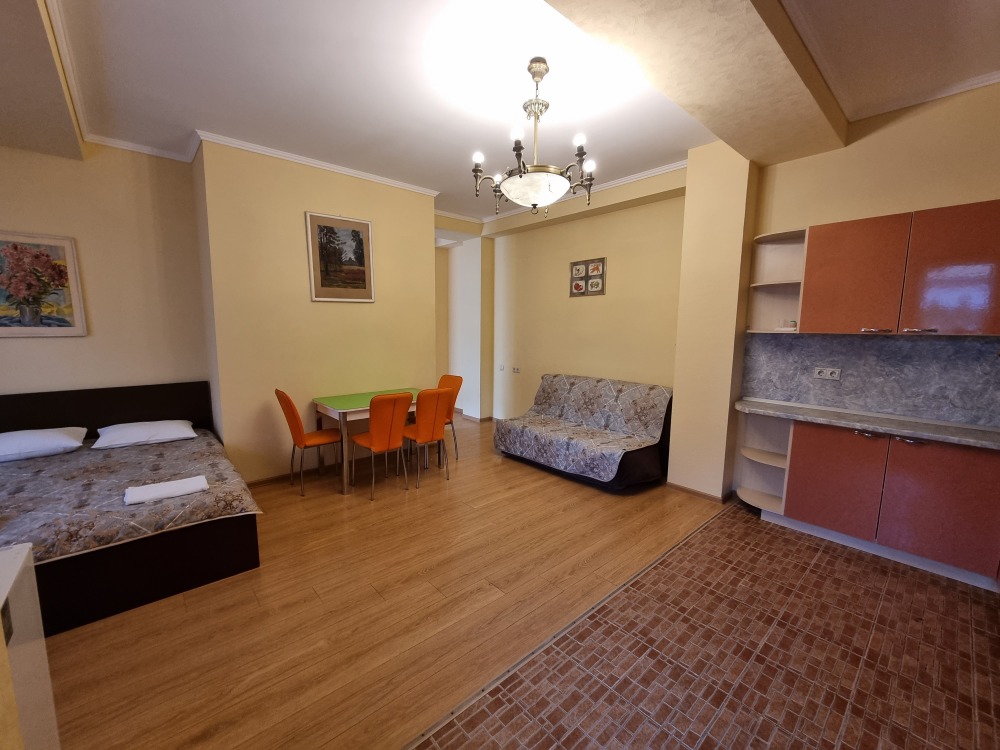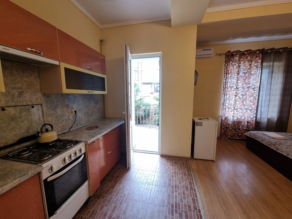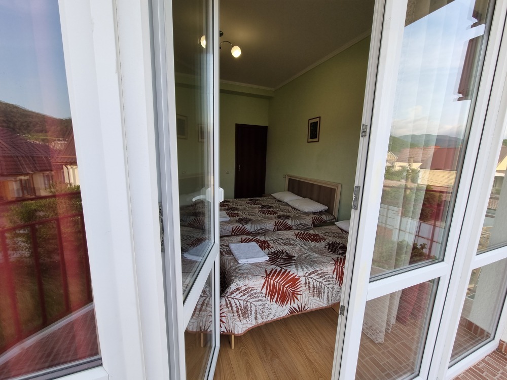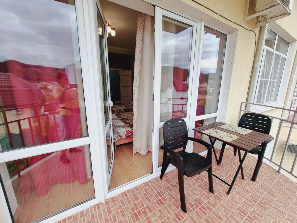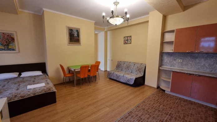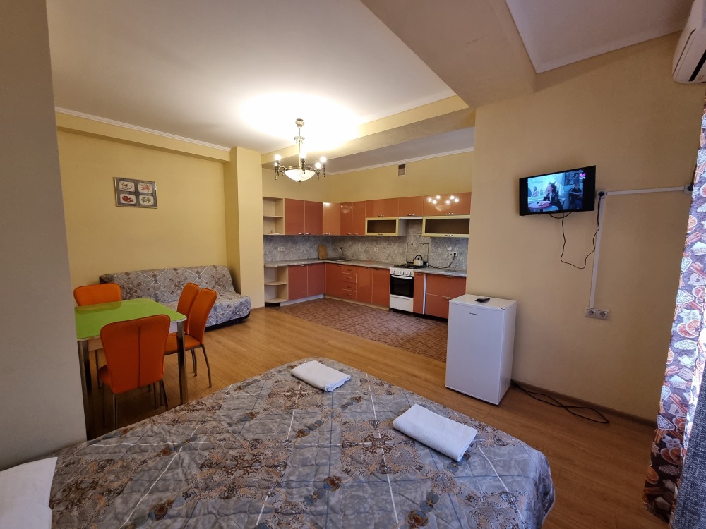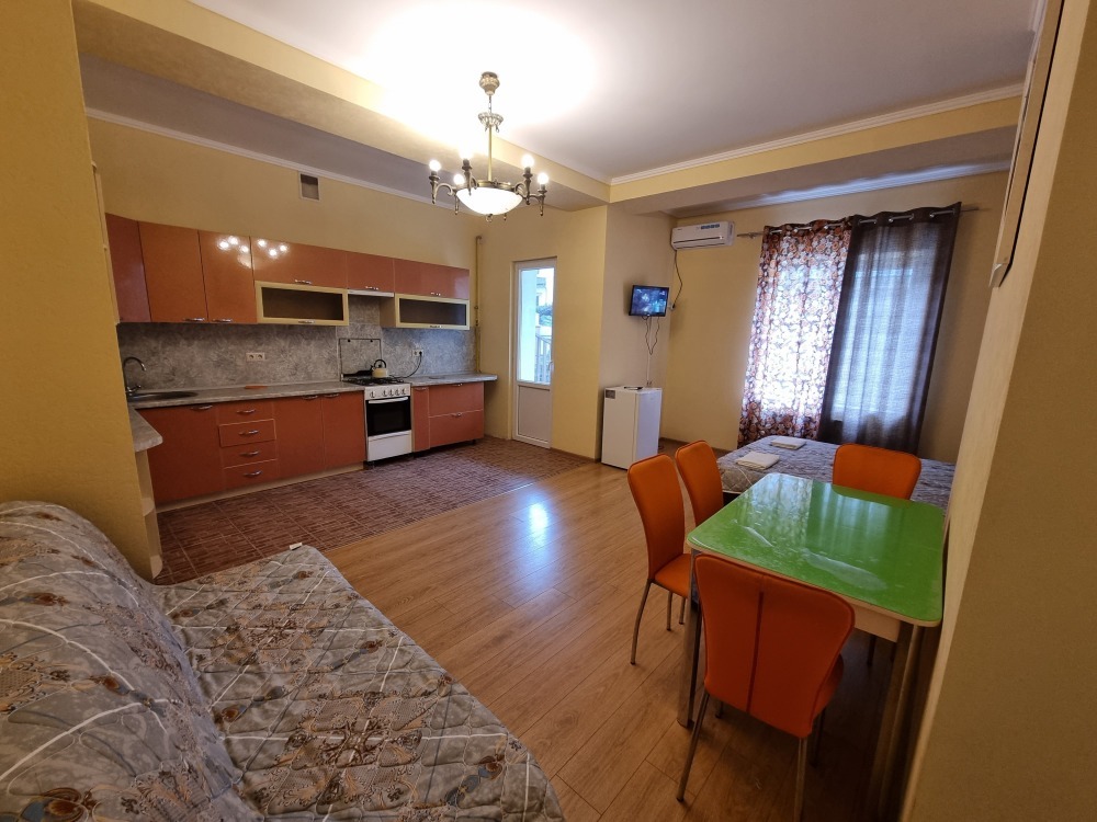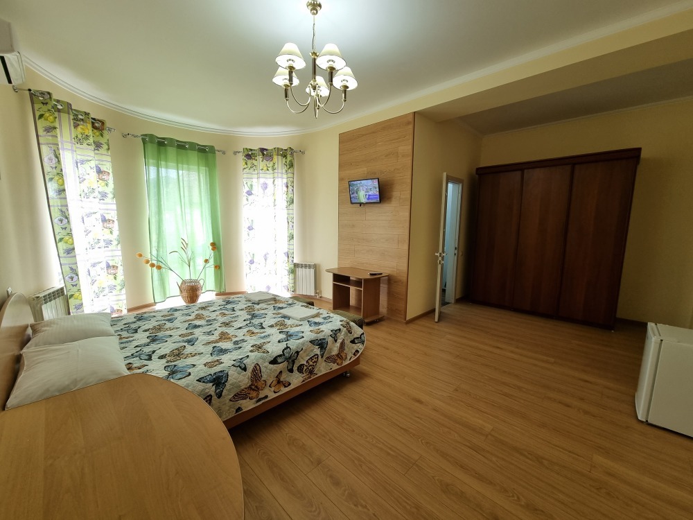 В номере: двуспальная кровать, двуспальный диван-кровать, телевизор, кондиционер, холодильник, кухонный обеденный стол со стульями, шкаф, встроенная кухня с газовой плитой и духовкой, тумбочки, плотные занавески, фен, вешалка, 1 этаж, балкон, крыльцо, отдельный вход, набор садовой мебели на балконе. Санузел совмещенный с душем в номере.