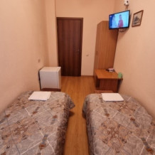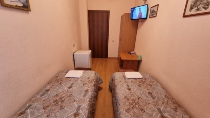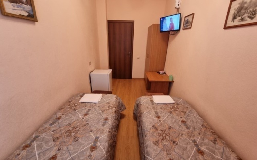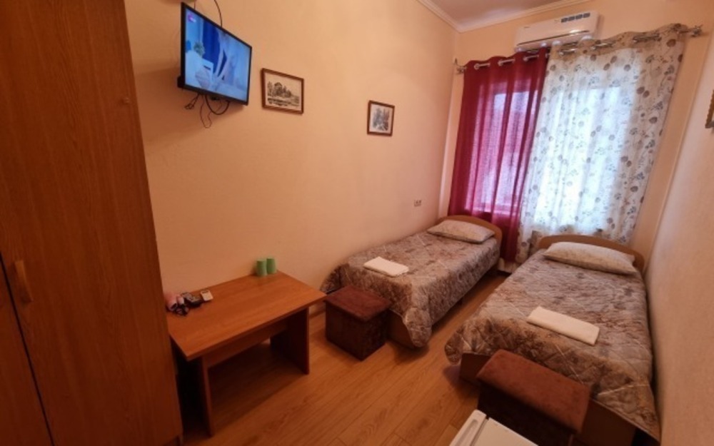 В комнате: две односпальные кровати, телевизор, кондиционер, холодильник, журнальный стол, шкаф, пуфики, плотные занавески, фен.