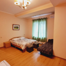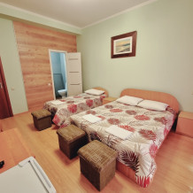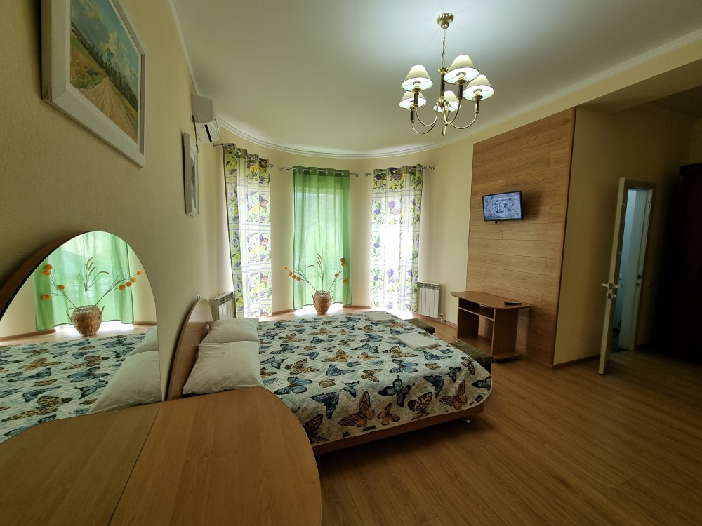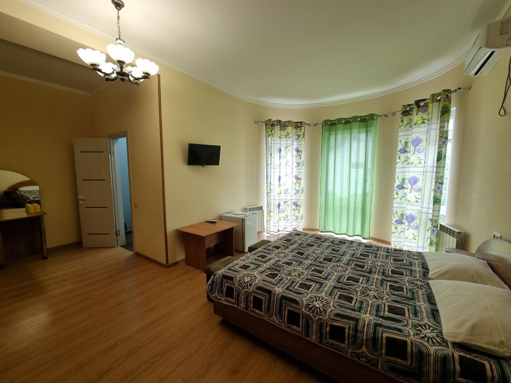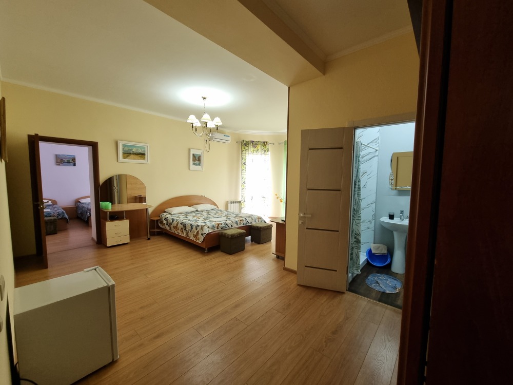 В номере: 2 комнаты - двуспальная кровать, 3 односпальные кровати, 2 телевизора, 2 кондиционера, холодильник, стол, туалетный столик, шкаф-гардеробная, тумбочки, пуфики, плотные занавески, фен, эркер. Санузел совмещенный с душем в номере. 1 этаж.