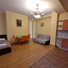 В номере: 2 комнаты - двуспальная кровать, 3 односпальные кровати, 2 телевизора, 2 кондиционера, холодильник, журнальный стол, шкафы-гардеробные, комод, тумбочки, пуфики, плотные занавески, фен, балкон. Санузел совмещенный с душем в номере.