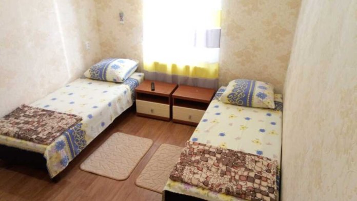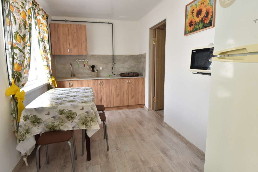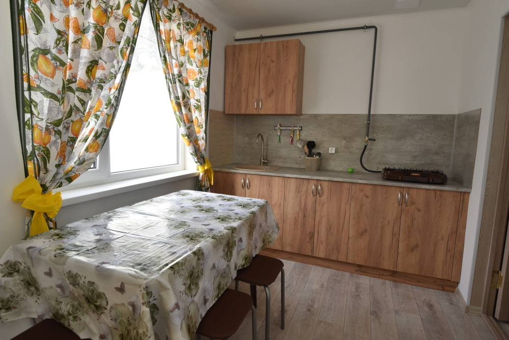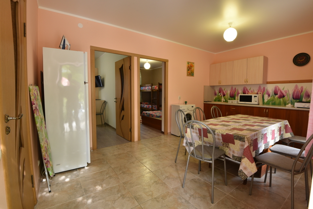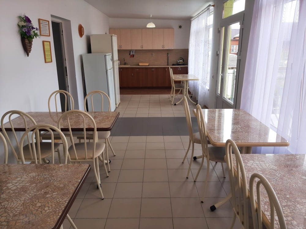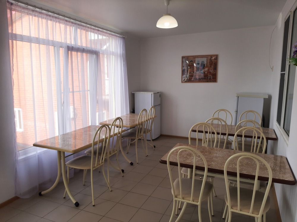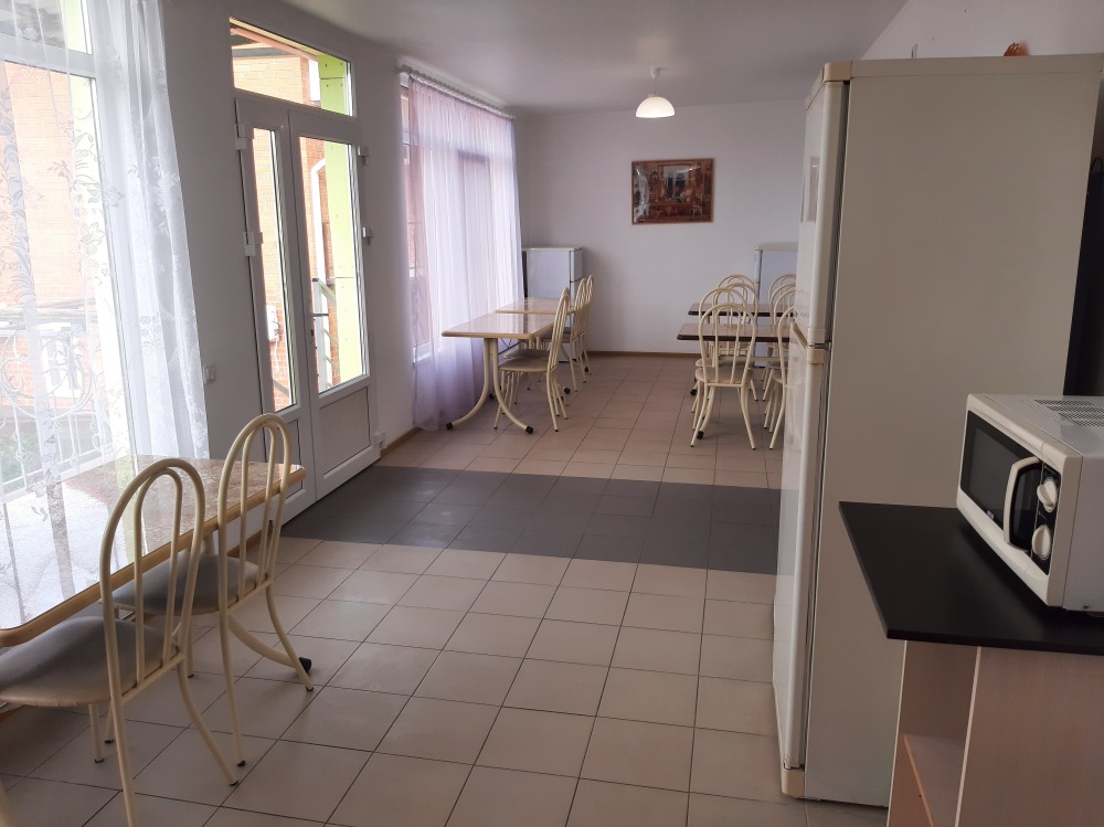 Есть общая кухня со всем необходимым для приготовления еды. За каждым номером закреплён отдельный стол и холодильник.