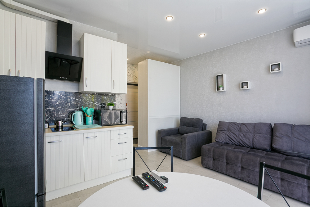 В квартире двухспальный диван и односпальное кресло-кровать, можно разместить три человека. Есть зона кухни: варочная поверхность. микроволновка, холодильник, электрочайник, посуда для принятия и приготовления пищи. В комнате телевизор SMART, кондиционер,WI-FI. Есть утюг, гладильная доска, фен, сушилка для белья, на балконе уличная мебель.