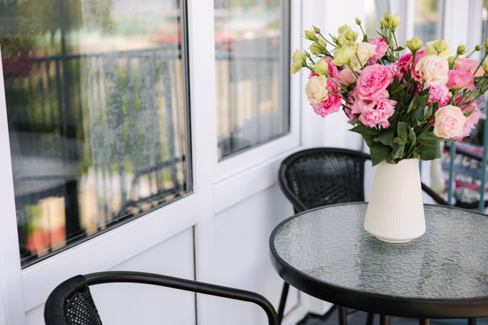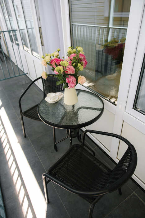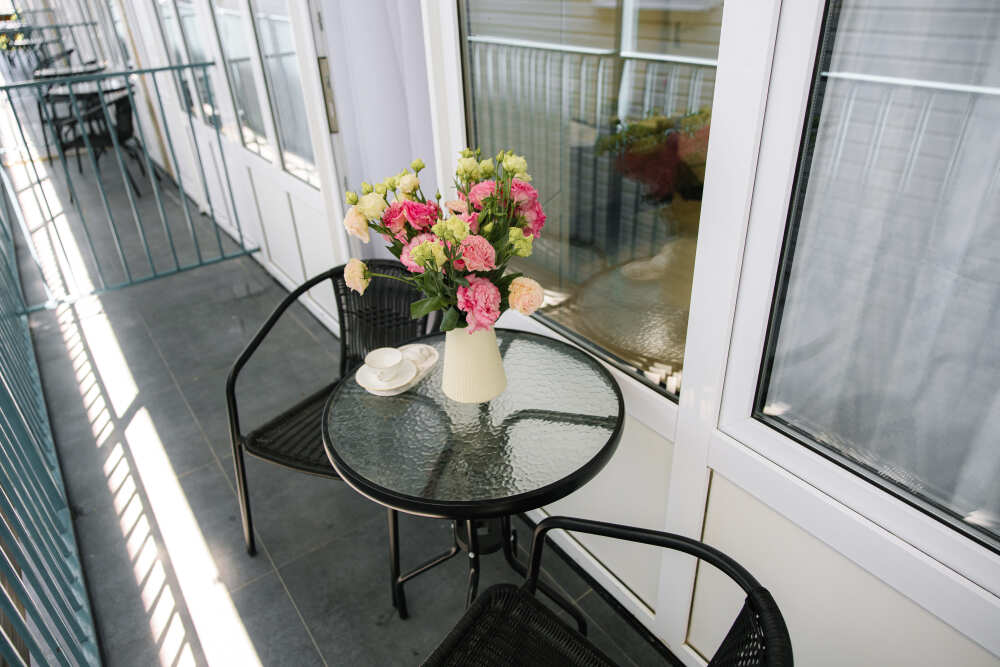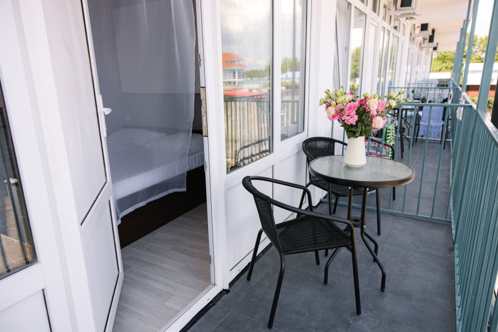 двуспальная или две односпальные кровати, санузел (душ, туалет, раковина), кондиционер, телевизор, балкон, уличная мебель (столик, два стула)