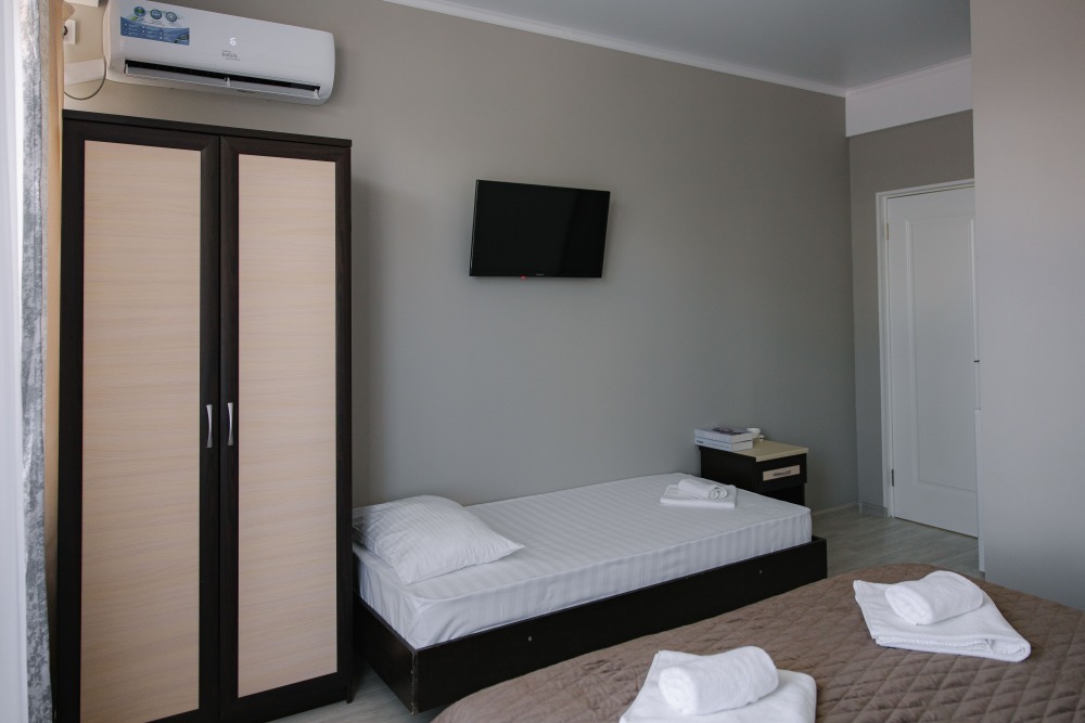 двуспальная и односпальная кровати, санузел, кондиционер, телевизор, холодильник.