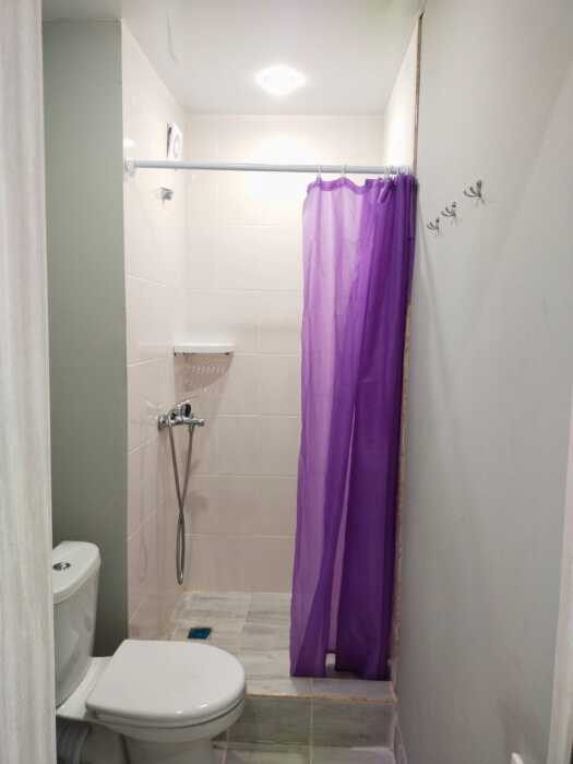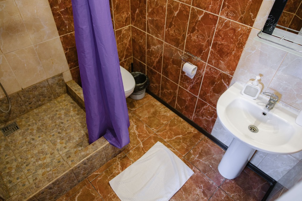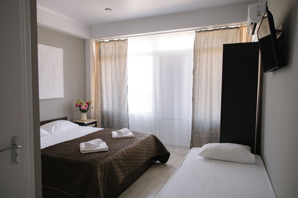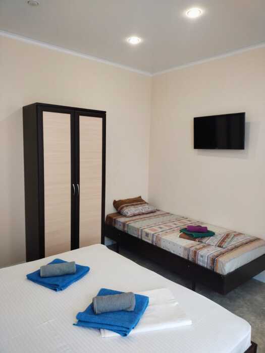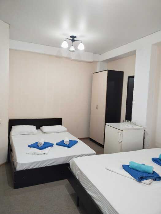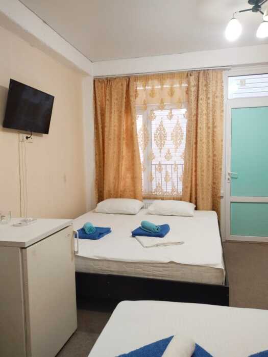 Две двуспальные и одна односпальная кровать, санузел (душ, туалет, раковина), сплит-система, телевизор, холодильник. Номер на 2 этаже.
