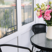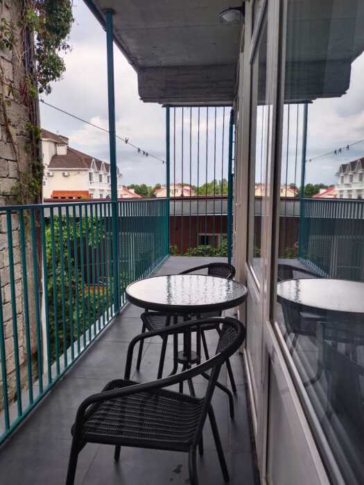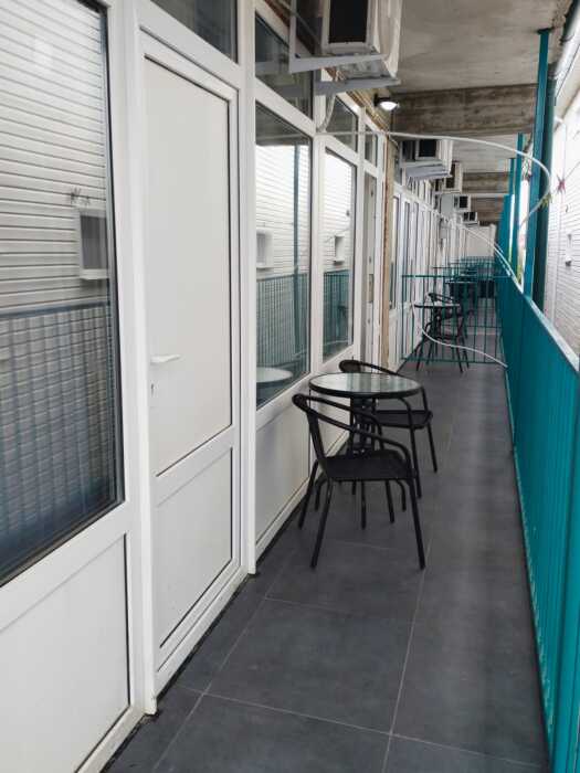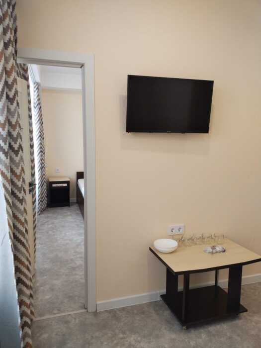 Двуспальная кровать в одной комнате, две односпальные - в другой. В каждой комнате: санузел, кондиционер, телевизор. Также в номере: холодильник, чайник, балкон (выход на балкон из одной комнаты), уличная мебель (столик, два стула).