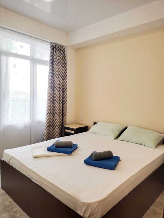 Двуспальная и односпальная кровать в одной комнате, раскладной диван - в другой. Также в номере: санузел (душ, туалет, раковина), холодильник, телевизор, сплит-система, балкон (выход на балкон из обеих комнат), уличная мебель (столик, два стула).