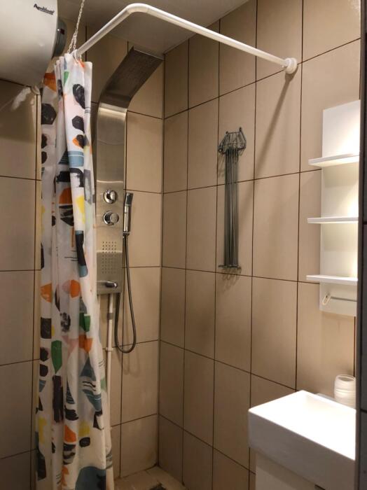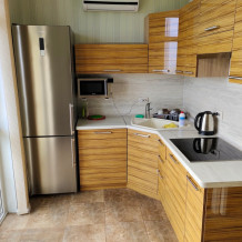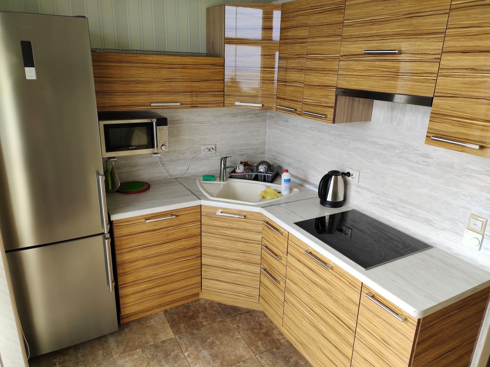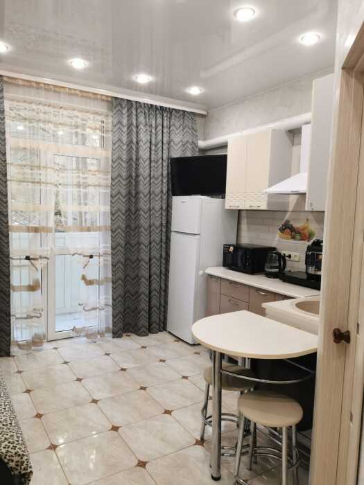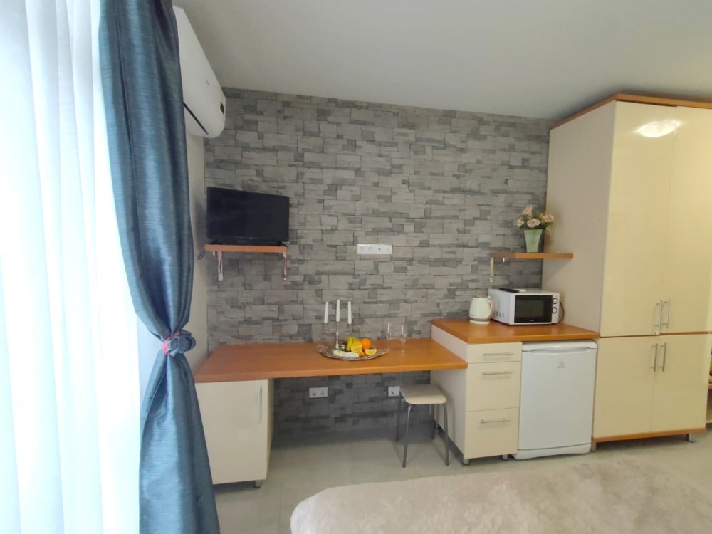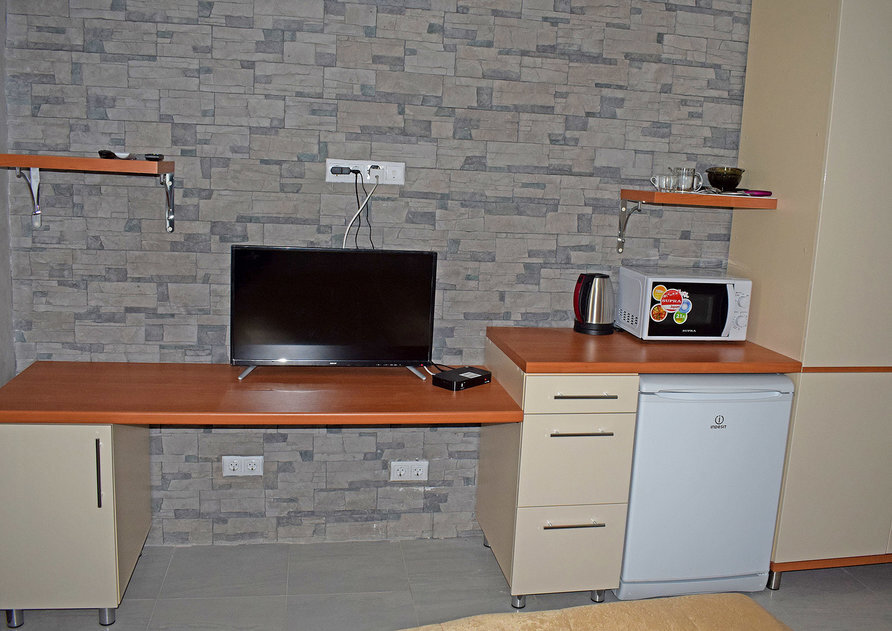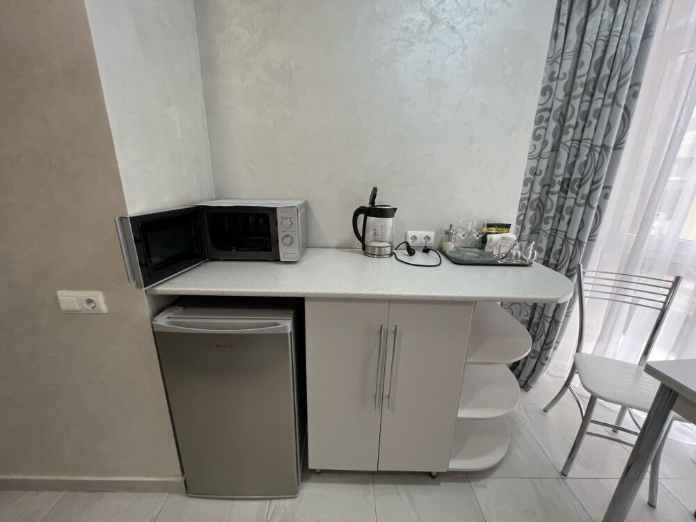В номере есть барная стойка, мультиварка, микроволновая печь, электрочайник, набор посуды.