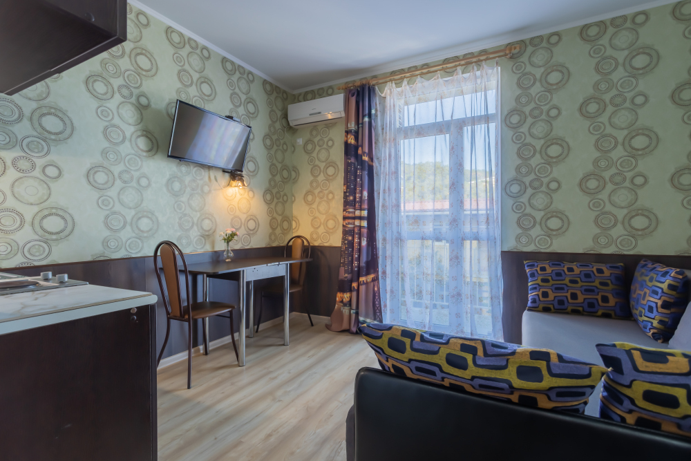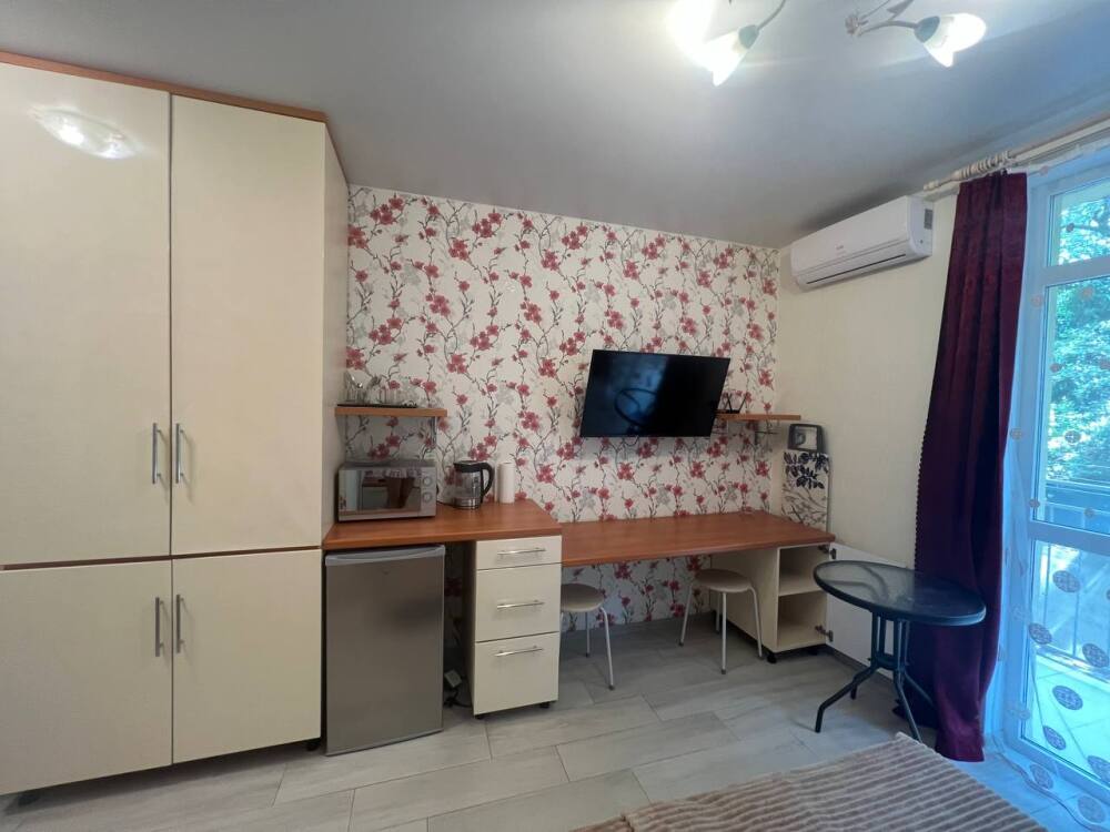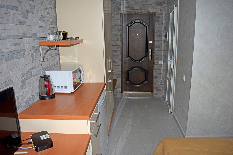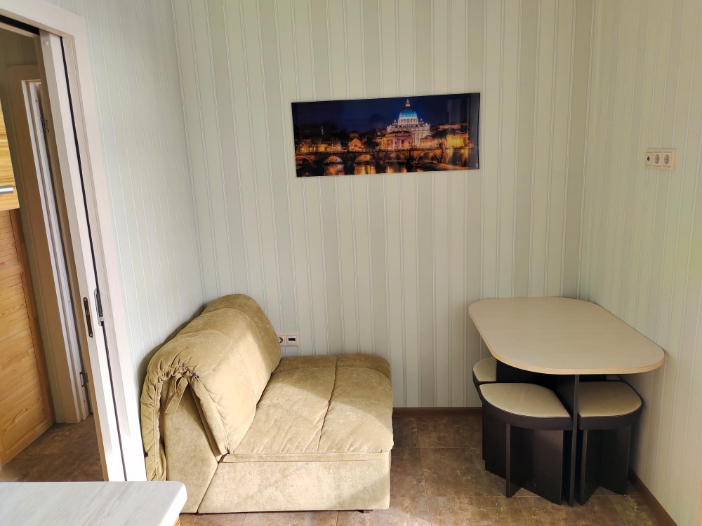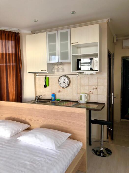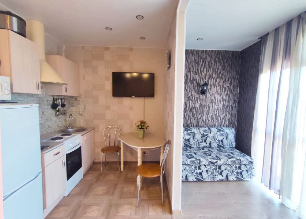 Небольшой уютный номер с полноценной кухней. В номере есть варочная поверхность, набор посуды, большой раскладной диван, балкон.