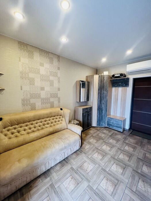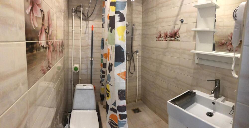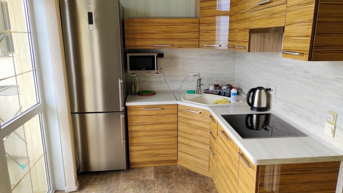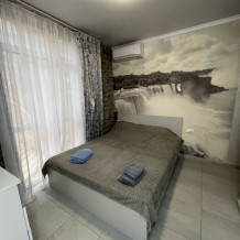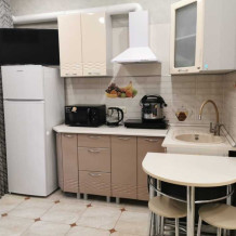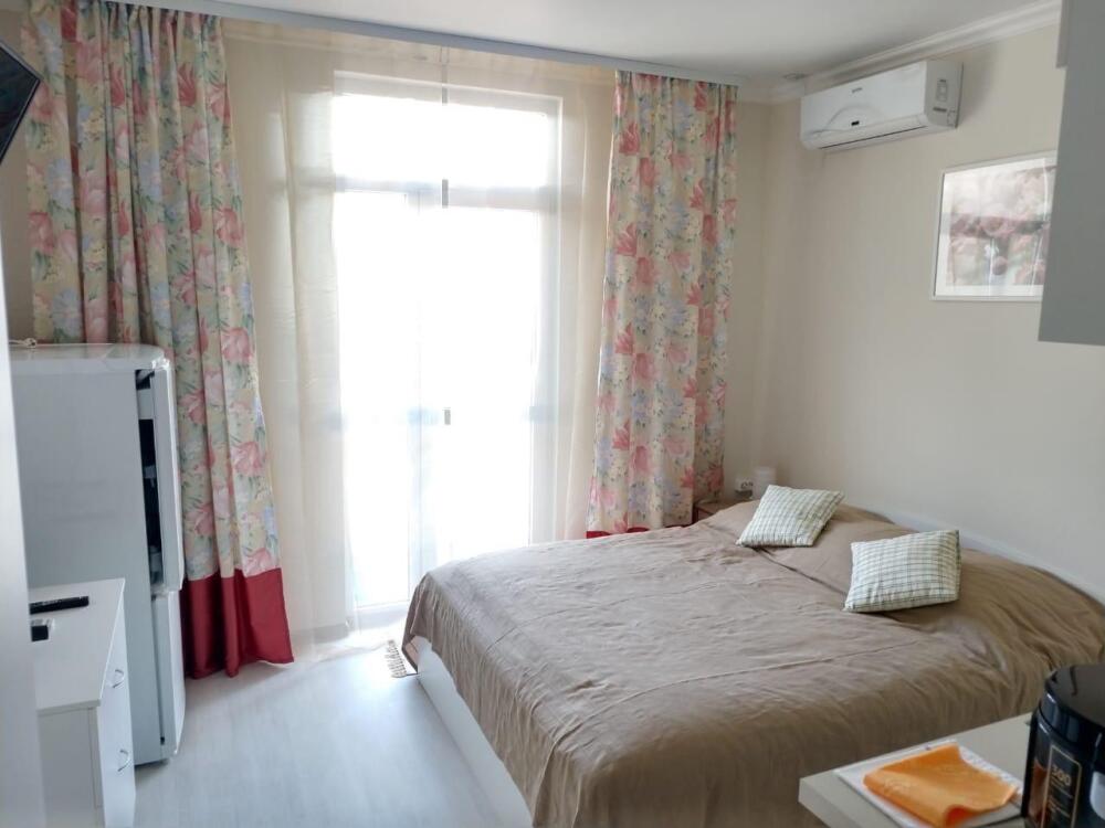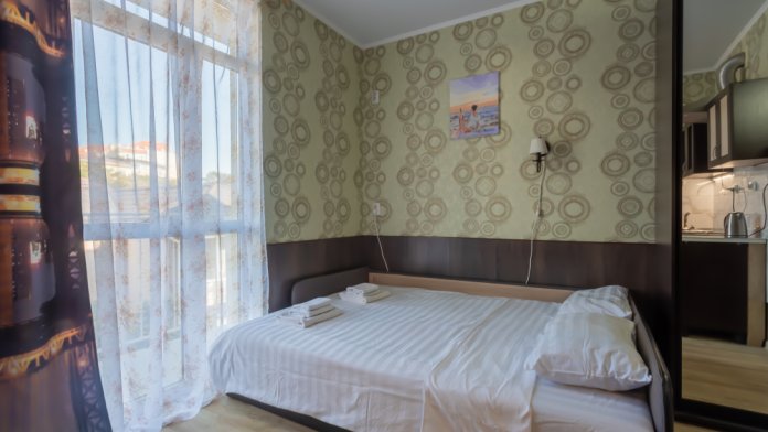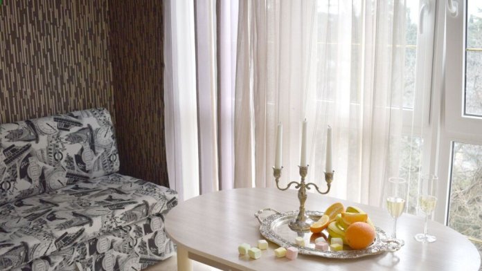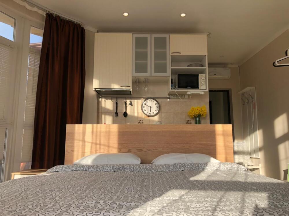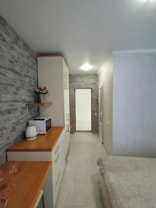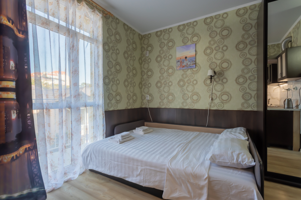 Небольшой уютный номер с полноценной кухней. В номере есть варочная поверхность, набор посуды, большой раскладной диван, балкон.