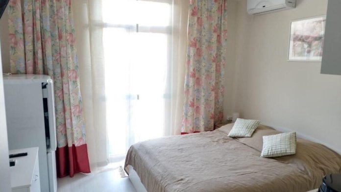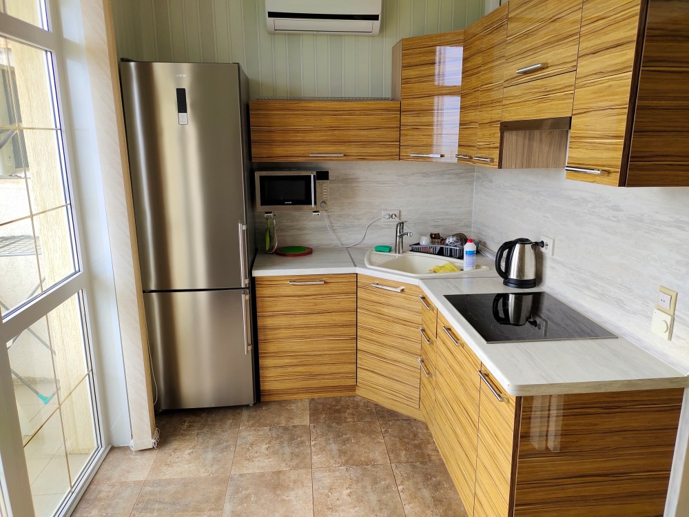 Уютные семейные апартаменты с полноценной кухней. Вид на море и горы. Есть плита, набор посуды, электрочайник, холодильник, стиральная машина, микроволновая печь.