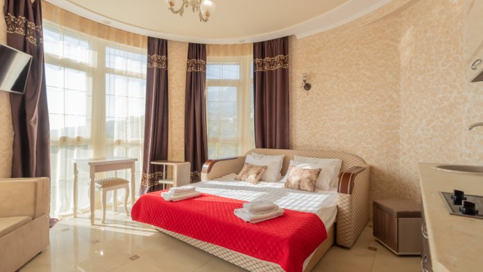 Апартаменты находятся в курортной зоне, в красивейшем месте, в 300 метрах над уровнем моря. Именно на этом расстоянии происходит целебное смешение потоков морского и горного воздуха, на этом уровне пряный воздух, пропитанный йодом и хвойными фитонцидами.