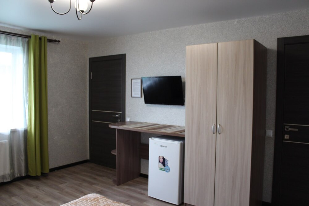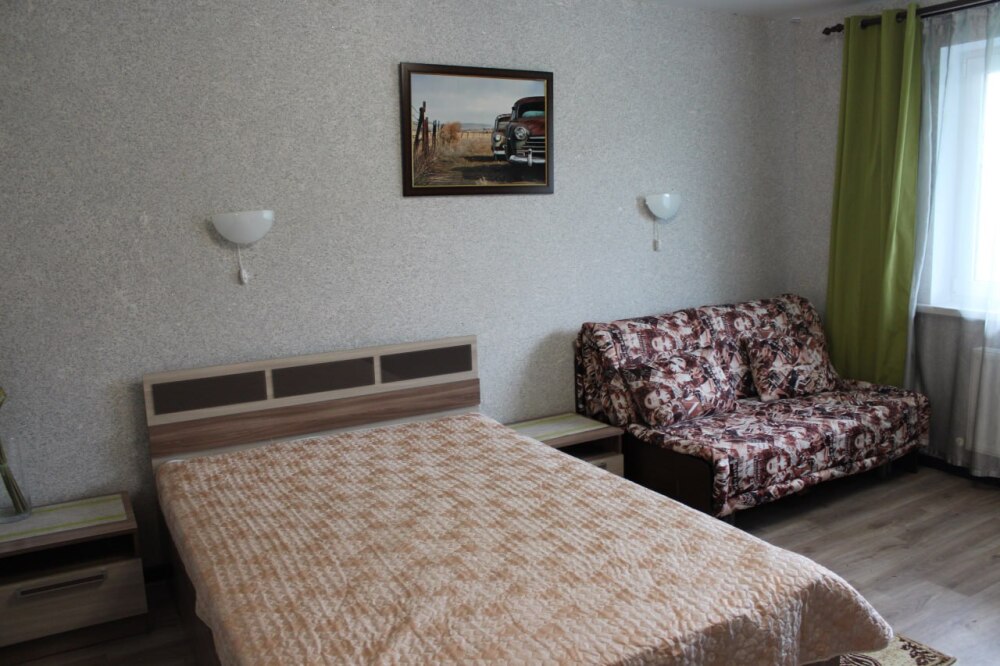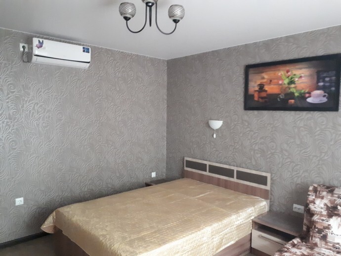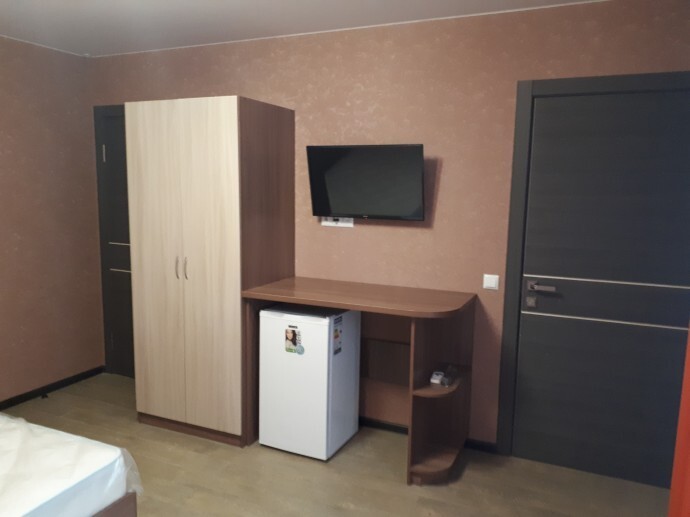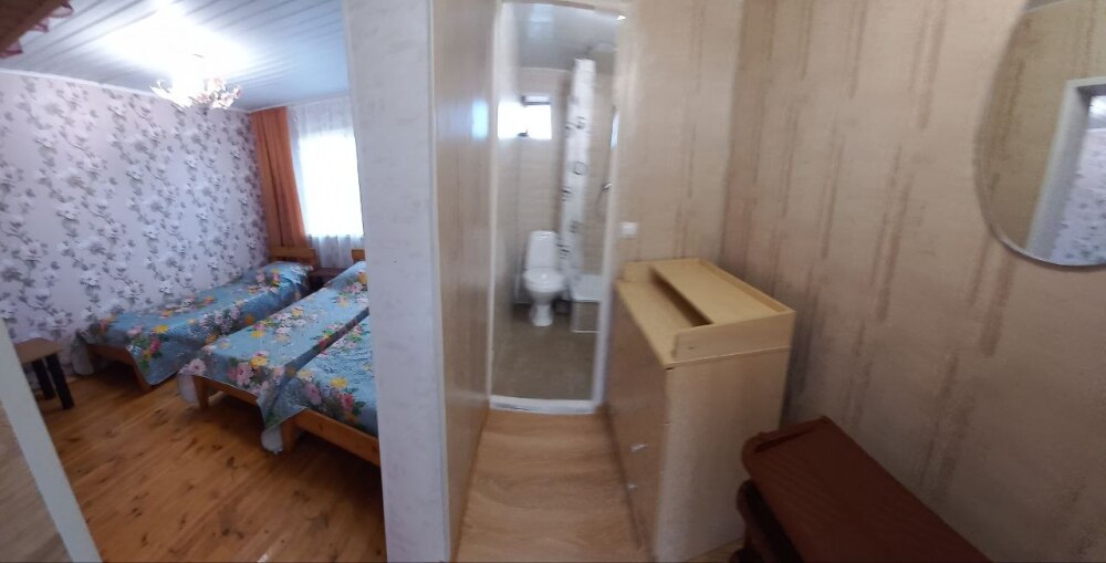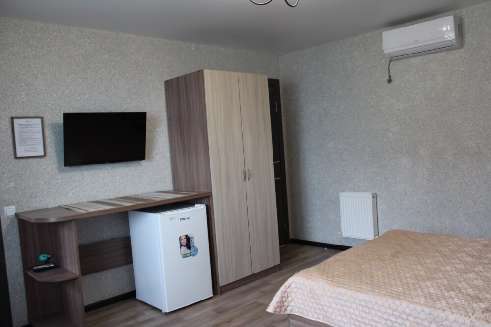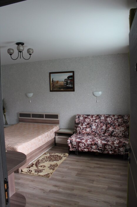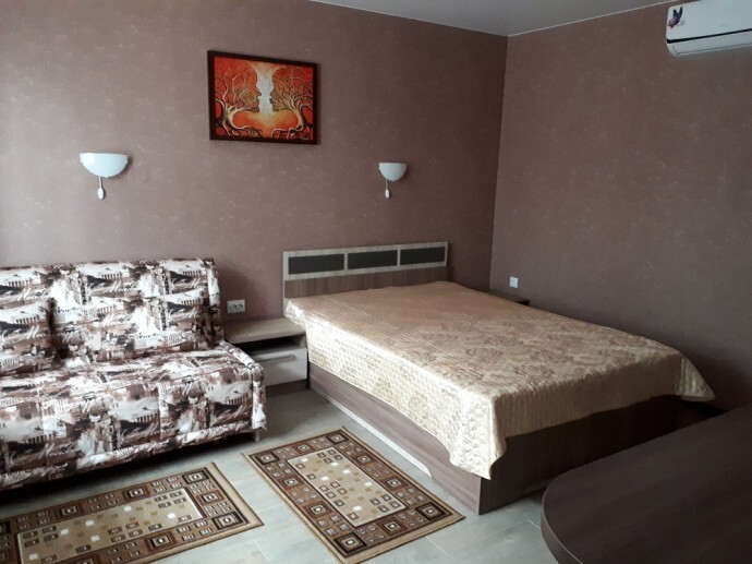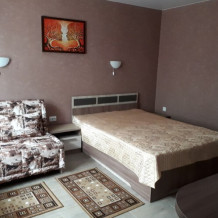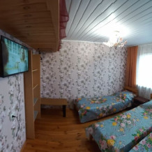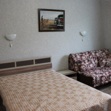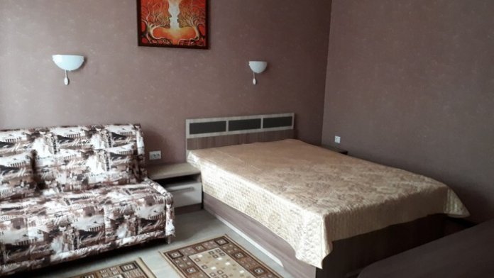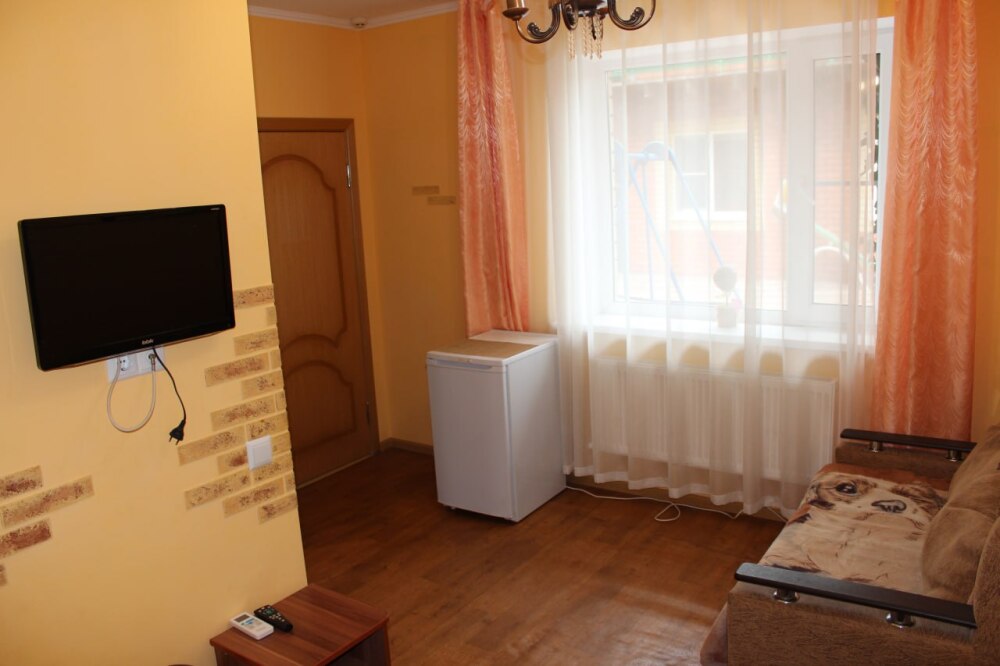Однокомнатный 4-местный благоустроенный номер на 1 этаже двухэтажного здания. В номере: двухспальная кровать, двухспальный раскладной диван, прикроватная тумбочка, холодильник, кондиционер (сплит), жк-телевизор, санузел, шкаф. Зона отдыха на улице.