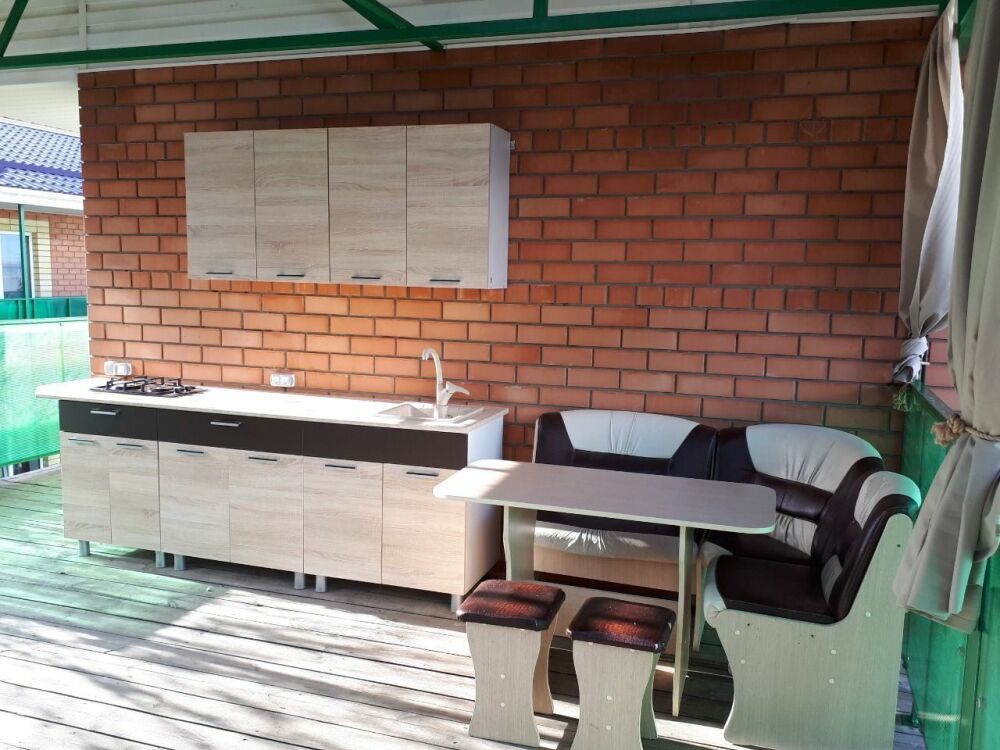 Четырехместный номер категории люкс, расположен на 1 этаже двухэтажного здания. На этаже вход на общую мини-кухню (на два люкса) и два изолированных люкса. При желании можно снять весь этаж для двух семей или большой компании. В каждом номере: двухспальная кровать, двухспальный раскладной диван, прикроватные тумбочки, шкаф, жк телевизор, кондиционер (сплит), санузел, холодильник, фен. На всей территории wi-fi. Зоны отдыха во дворе.