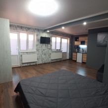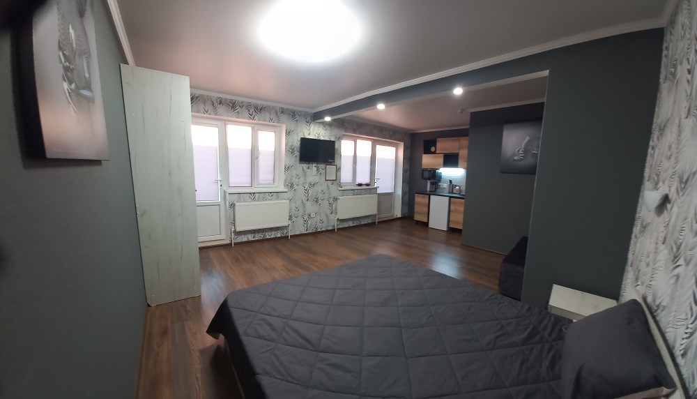 Четырехместный номер-студия (апартаменты) расположен на втором этаже двухэтажного здания имеет выход на террасу с летней кухней и видом на море. В номере: санузел с душем, фен, миникухня со всем необходимым, большая двухспальная кровать, двухспальный диван-кровать, тумбочки, шкаф,обеденный стол, зеркало, жк.телевизор с кабельными каналами.