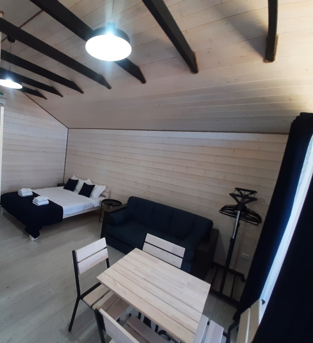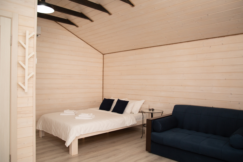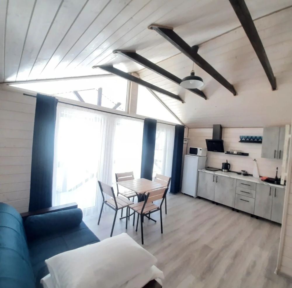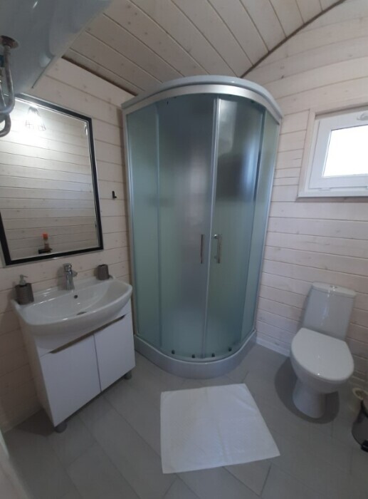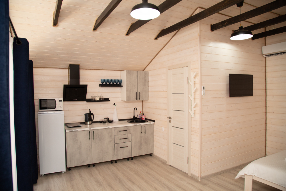 На территории нашей базы отдыха расположены четыре деревянных, новых (2022-2023 год постройки) домика со всеми удобствами, рассчитанные на 4 человека. Площадь домика 35 кв.м. В каждом доме двуспальная кровать, раскладной диван на 2 человека, сплит-система, телевизор. Собственная кухня: холодильник, электрочайник, микроволновая печь, индукционная плита, набор необходимой посуды. Санузел: душевая кабина, унитаз, раковина, зеркало, фен. Собственная веранда со столом и стульями.