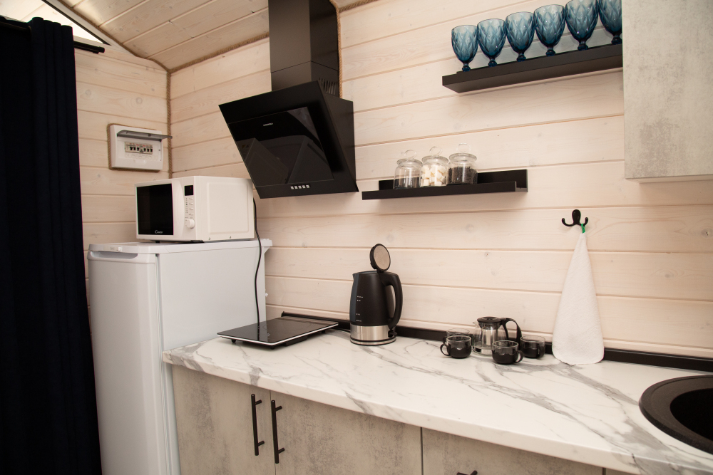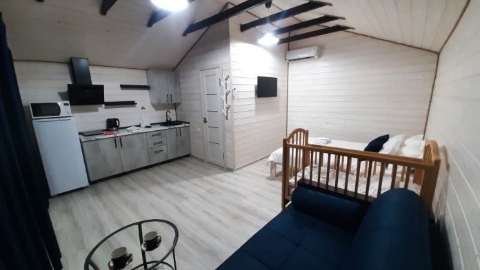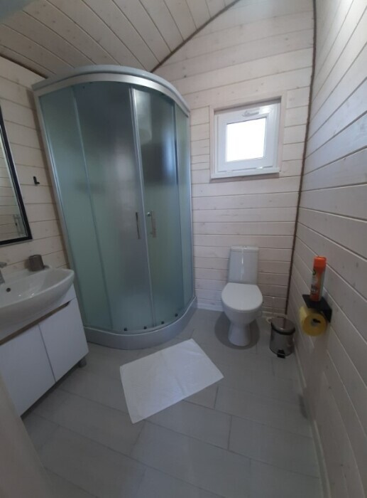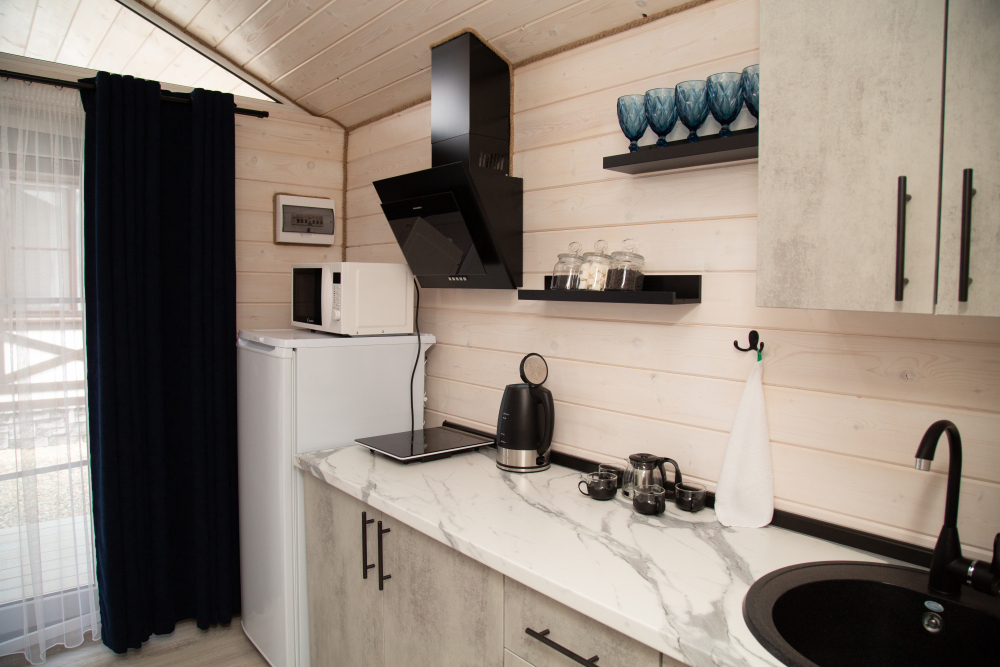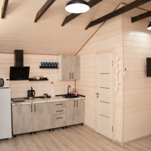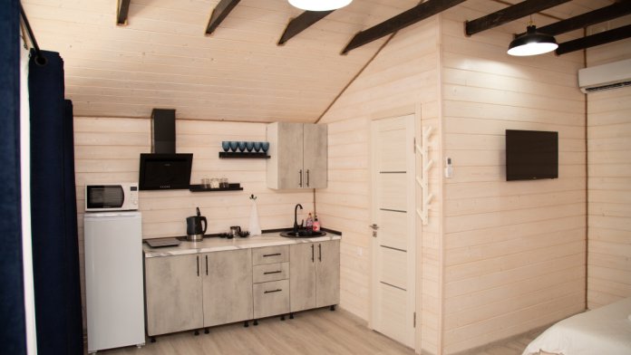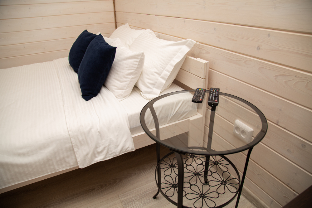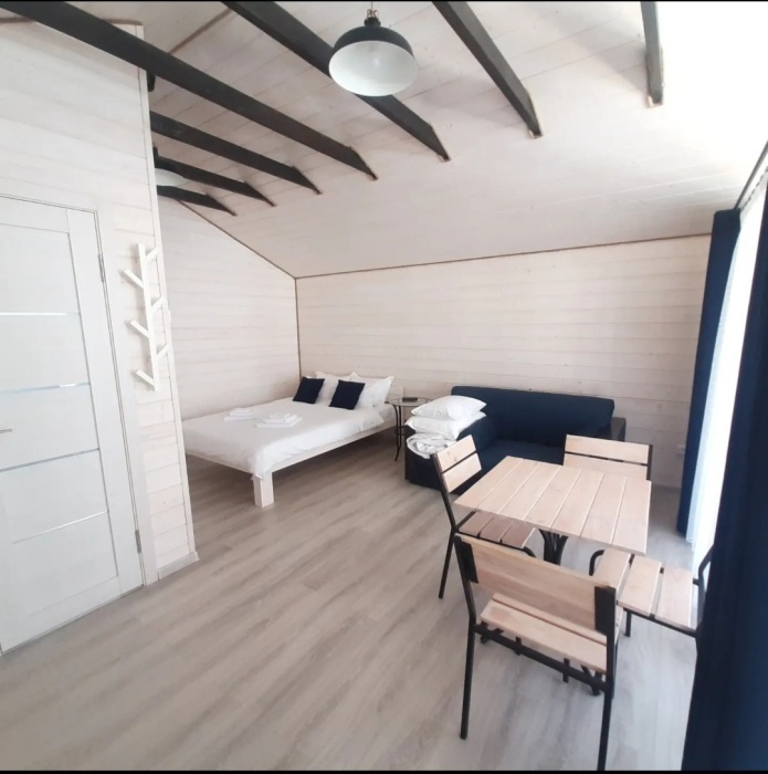 На территории нашей базы отдыха расположены четыре деревянных, новых (2022-2023 год постройки) домика со всеми удобствами, рассчитанные на 4 человека. Площадь домика 35 кв.м. В каждом доме двуспальная кровать, раскладной диван на 2 человека, сплит-система, телевизор. Собственная кухня: холодильник, электрочайник, микроволновая печь, индукционная плита, набор необходимой посуды. Санузел: душевая кабина, унитаз, раковина, зеркало, фен. Собственная веранда со столом и стульями.