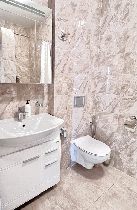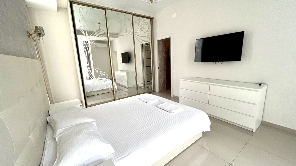 Большая удобная кровать позволит вам по-настоящему расслабиться и насладиться отдыхом. Квартира отлично зонирована для комфортного отдыха большой семьи: в гостиной есть возможность уединиться, а также две раздельных ванных комнаты, для комфортного проживания в квартире. А красивое многоуровневое освещение и постельные принадлежности из натуральных материалов добавят к общей атмосфере романтики и уюта.