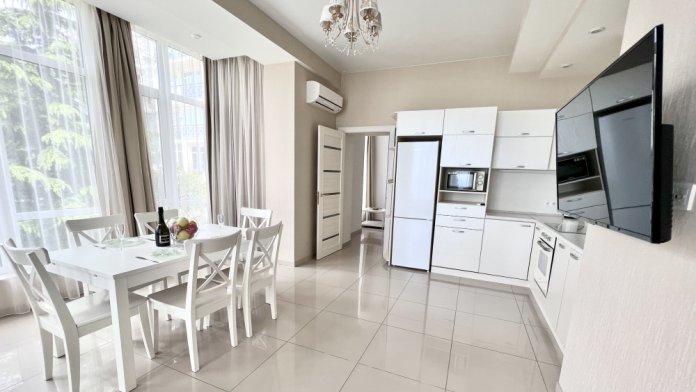 Внутри квартиры также можно наслаждаться красотой и уютом: дизайнерский интерьер, качественный и красивый ремонт в светлых тонах, создают атмосферу комфорта и релаксации.