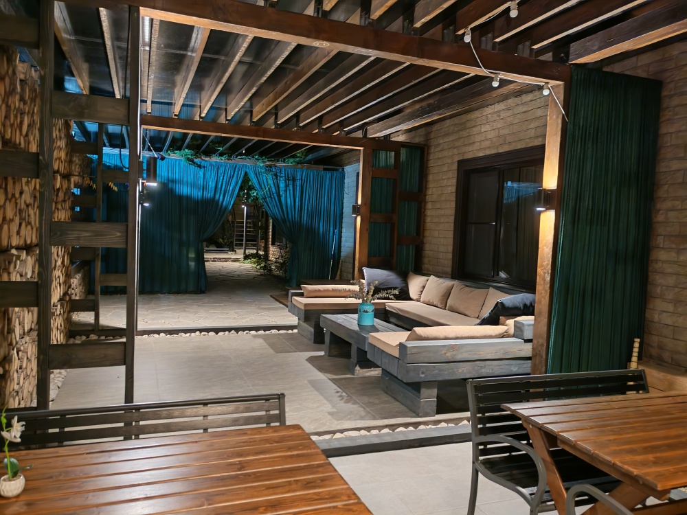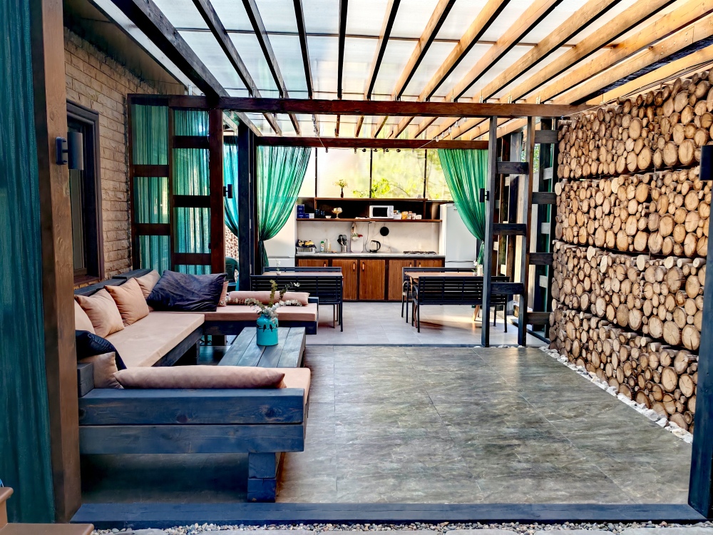 Уютный дворик с перголой и дизайнерской деревянной мебелью, кухонная зона и мангал еще никого не оставляли равнодушными.