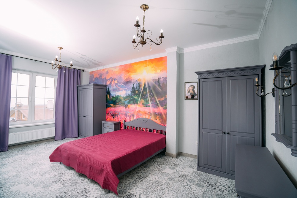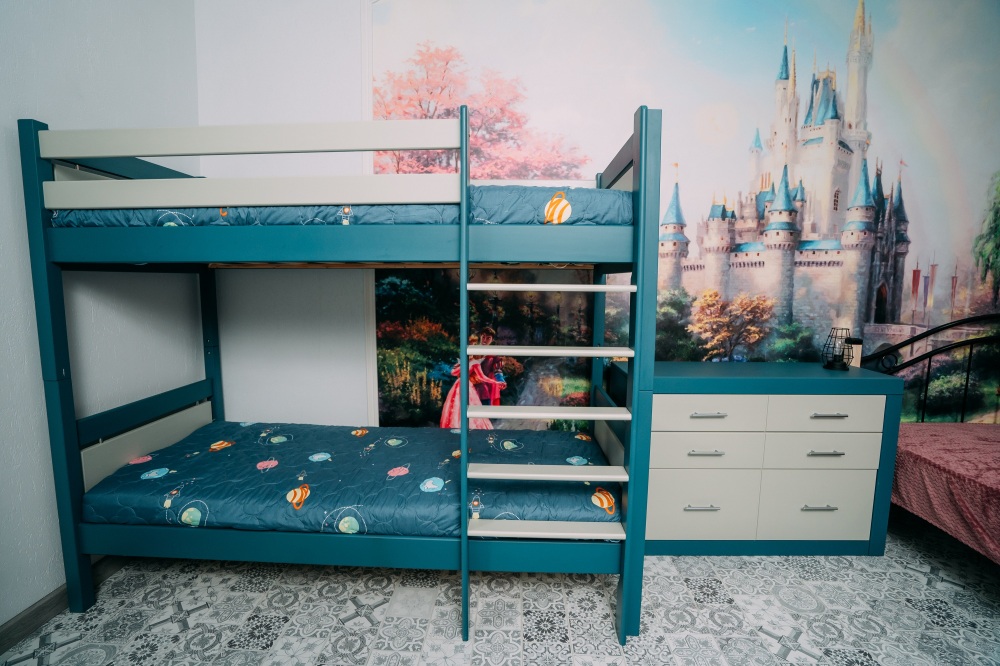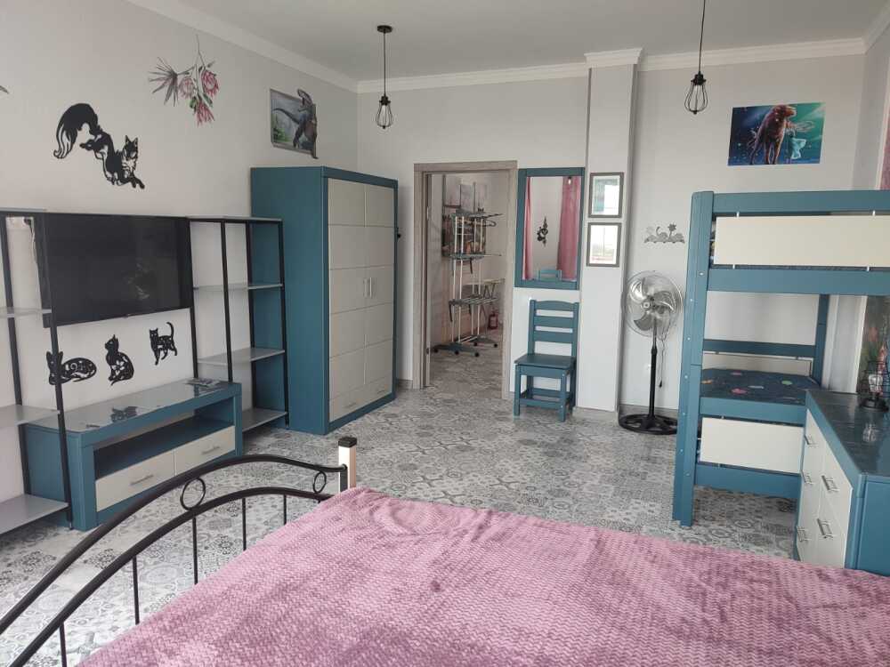 В доме расположены две спальни, детская, гостиная, игровая комната, кухня-столовая.