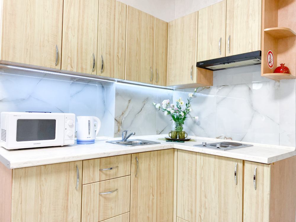 Кухня со всеми принадлежностями, электроплита,микроволновка, вытяжка , холодильник, электрочайник.